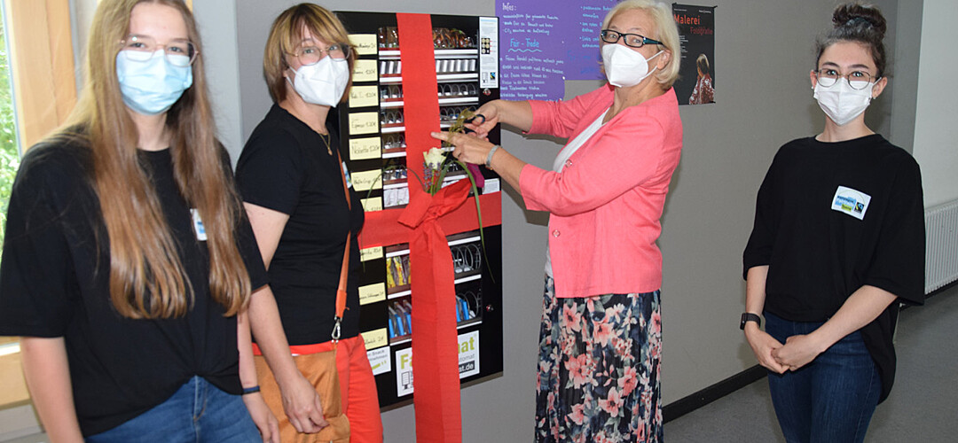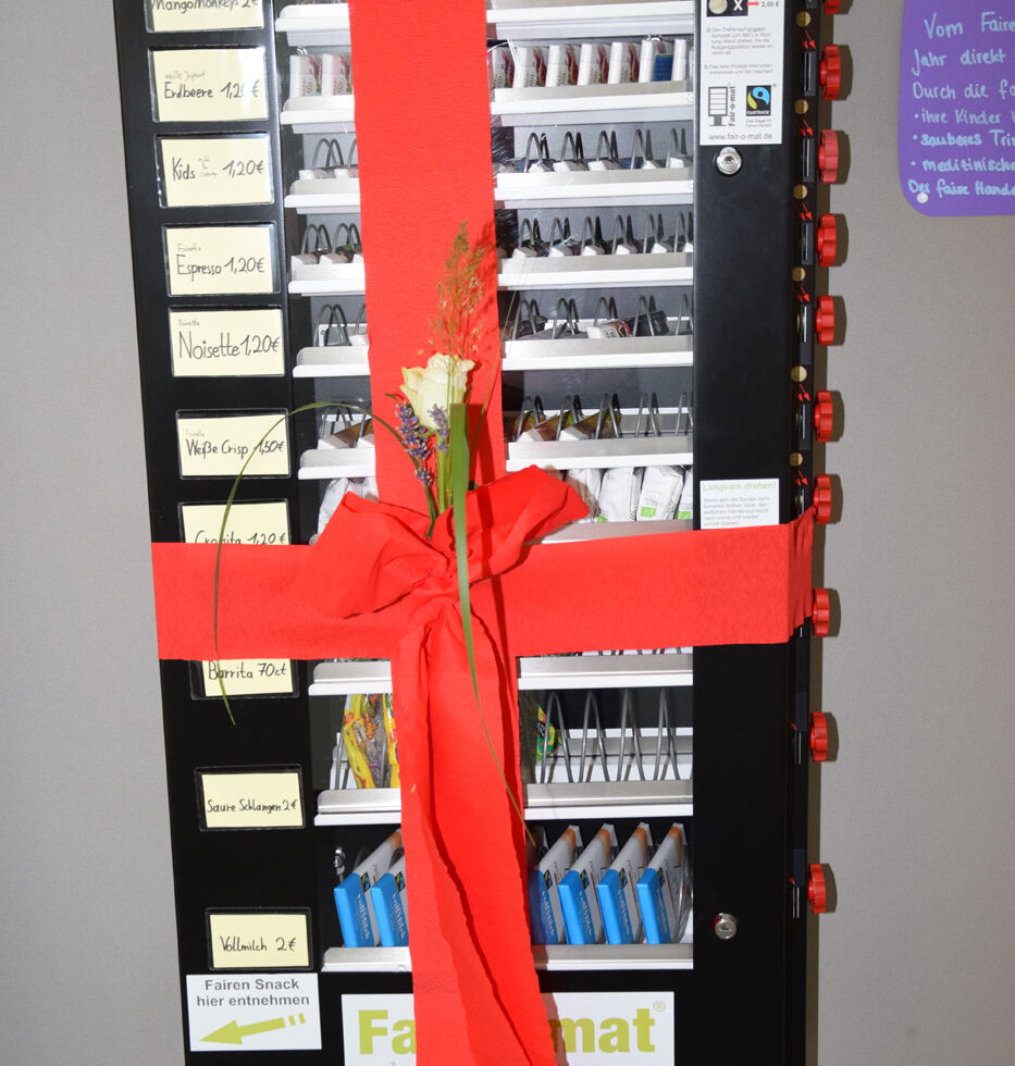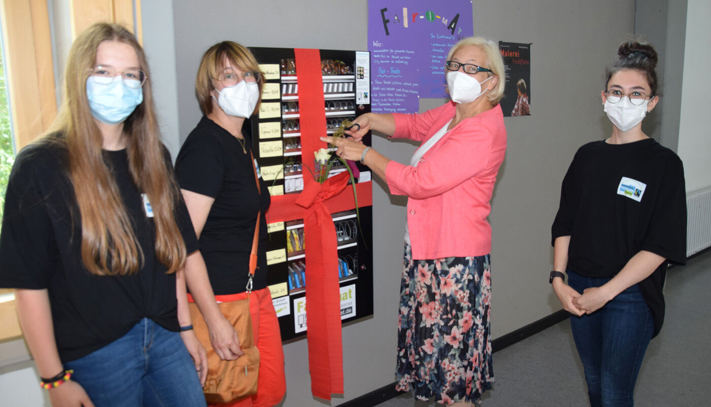 Mit einer kleinen Feierstunde übergab der AK Fair Trade des Camerloher-Gymnasiums am Montag, 19. Juli, einen Fairomaten offiziell seiner Bestimmung. Mit diesem Automaten können sich die Schülerinnen und Schüler nun rund um die Uhr mit fair gehandelten Produkten versorgen.
