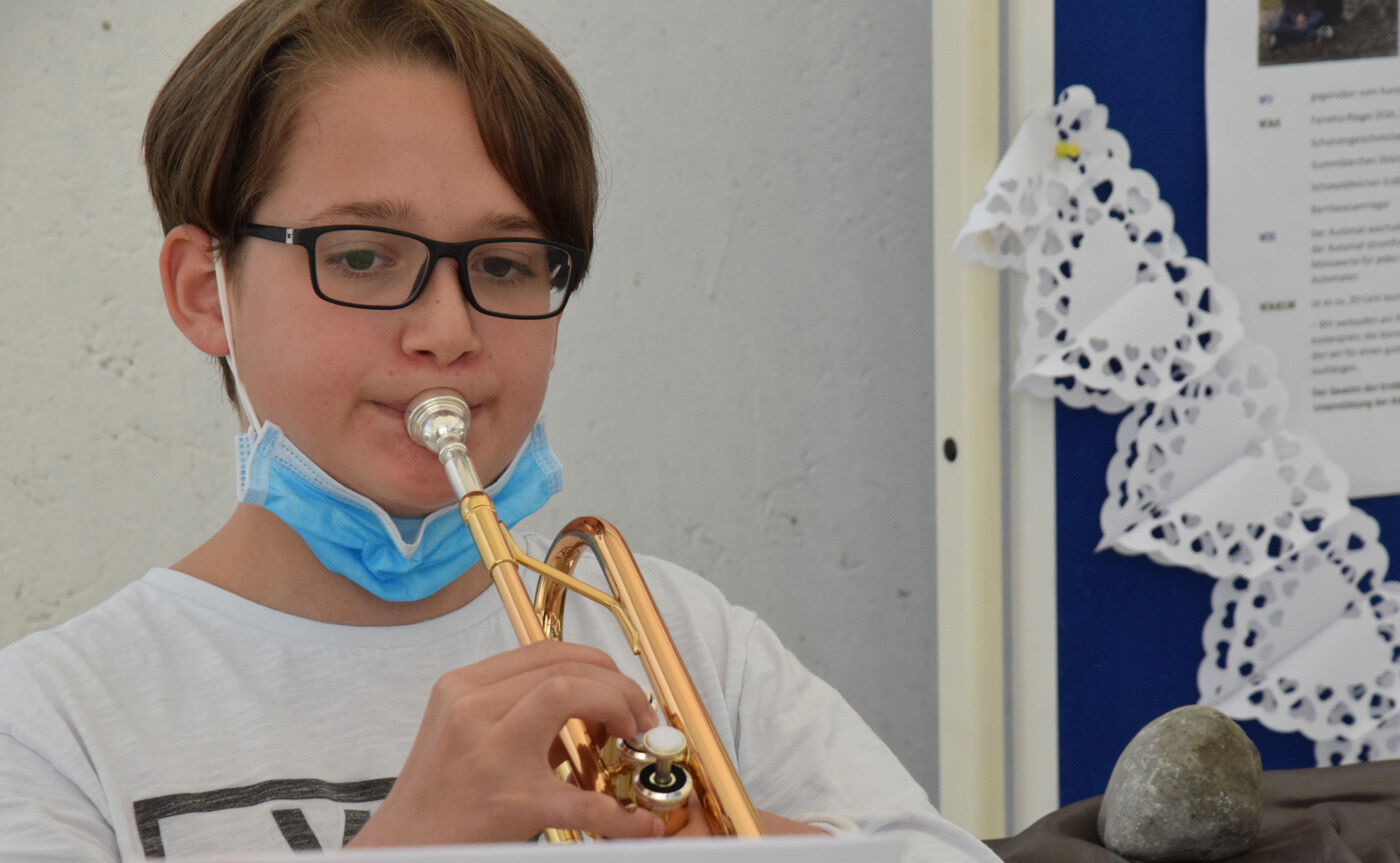 Constatin Hariades aus der Klasse 5a sorgte mit einem Trompetenstück für den Willkommensgruß. „Auch wenn es manchmal mühsam war: Wir haben niemals die Geduld und die Begeisterung verloren“, sagte Elena Kotny (Klasse 7a) bei der Begrüßung der Schülerinnen und Schüler und der Gäste, darunter Monika Hobmair und Johanna Sticksel vom Fairen Forum der Stadt Freising.