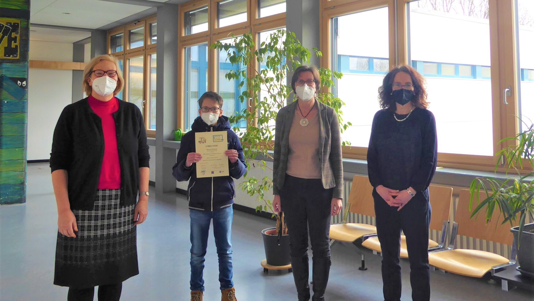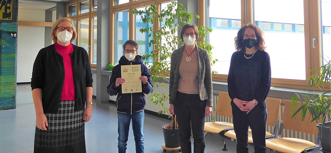 Er überprüfte das Leuchtverhalten in einer Verschaltung mit fünf Lampen, untersuchte unter Verwendung eines mit Wasser gefüllten Gefäßes das Sonnenlichtspektrum und stellte den Zusammenhang zwischen der Dicke eines Milchschaums auf dem Kaffee und dessen Abkühlvorgang her. Seine Arbeit wurde von Jury mit einem zweiten Preis und einer Einladung zur nächsten Wettbewerbsrunde belohnt, er gehört damit zu den besten 30 % seiner Altersstufe. In Anerkennung seiner großartigen Leistung überreichte ihm die Schulleiterin Frau Bliese in Anwesenheit seiner Klassenlehrerin Frau Elke Balzhäuser und der Betreuerin des Wettbewerbs Frau Birgit Eisner die Urkunde. Wir gratulieren Manuel Schmidt ganz herzlich und drücken ihm die Daumen für die nächste Wettbewerbsrunde!