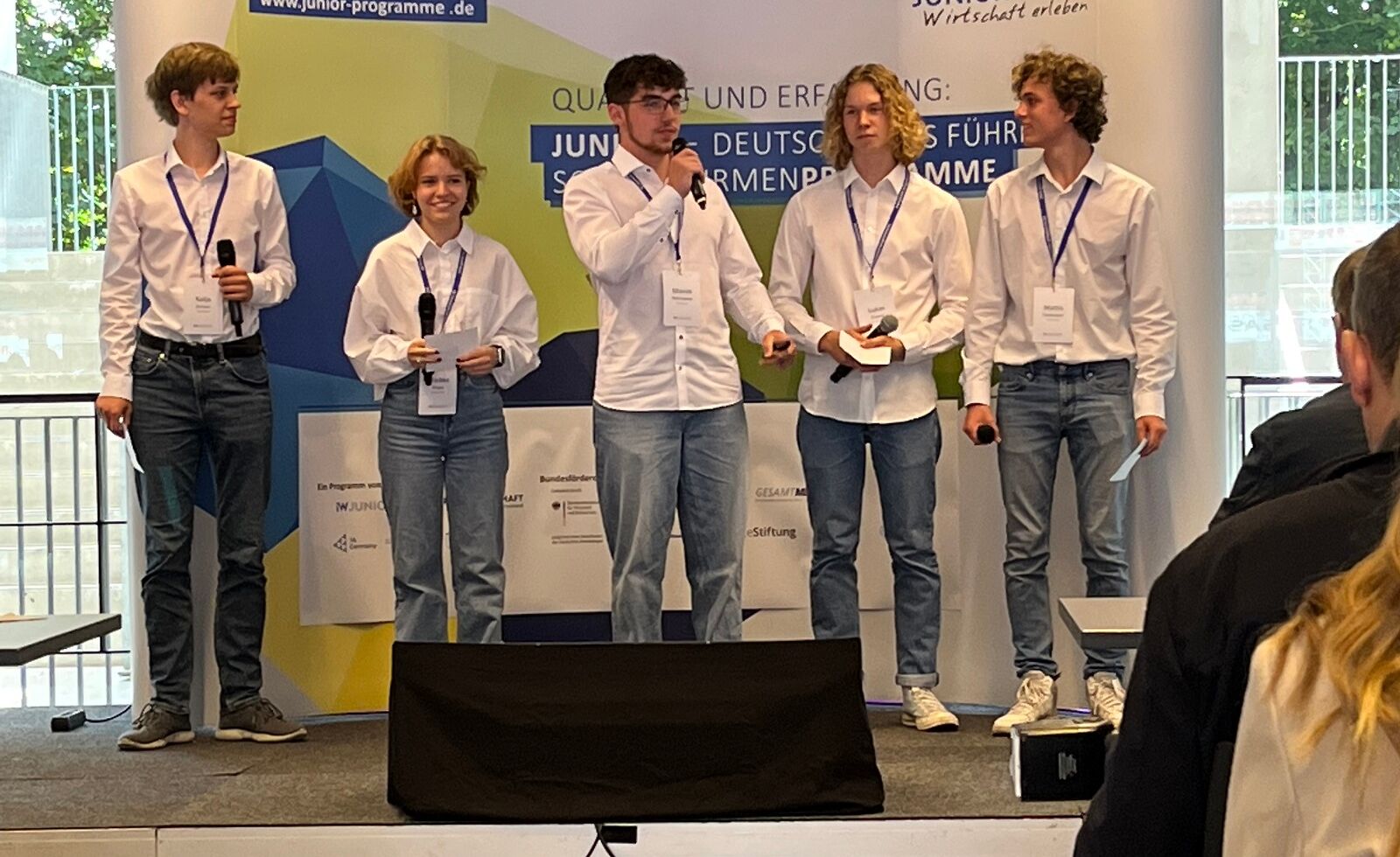 Am Abend fand ab 19 Uhr die Preisverleihung im Rahmen eines festlichen Award-Dinners statt. Und es sollte spannend werden, welches der 16 Teams Deutschland im Juli beim JUNIOR-Europa-Wettbewerb in Tallinn vertreten würde. Letztlich landete das Team Carducation (Kartenspiel zum Thema Nachhaltigkeit) aus Hessen vor Düsselrein aus Nordrhein-Westfalen (nachhaltige Naturseife und andere Pflegeartikel aus überschüssigem Bier) und Dat Plattebauk (Kinderbuch auf Plattdeutsch) aus Niedersachsen auf dem ersten Platz. Obwohl Camtucho keinen Preis gewann, war die Stimmung weiterhin bestens und meine SchülerInnen genossen die Party zum Abschluss der Veranstaltung. Gerade auch der Austausch mit den anderen TeilnehmerInnen des Wettbewerbs sowie den MitarbeiterInnen von JUNIOR sowie der Jury in entspannter Atmosphäre sorgten für einen überaus gelungenen Abend. Besonders im Gedächtnis bleiben wird uns dabei sicherlich auch das höchst interessante persönliche Gespräch mit Prof. Dr. Michael Hüther, dem Direktor des Instituts der deutschen Wirtschaft (IW), den man bisher nur aus den Medien kannte. Aufgrund der vielen positiven Rückmeldungen und Kauf-Anfragen steht nun sogar die Überlegung im Raum, die Produktion der Flaschenöffner noch einmal aufzunehmen und Camtucho als „erwachsenes“ Unternehmen fortzusetzen. Wir dürfen gespannt sein. In jedem Fall wünsche ich euch für die Zukunft viel Erfolg und alles erdenklich Gute!