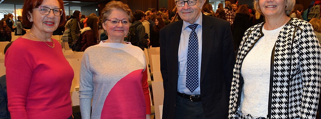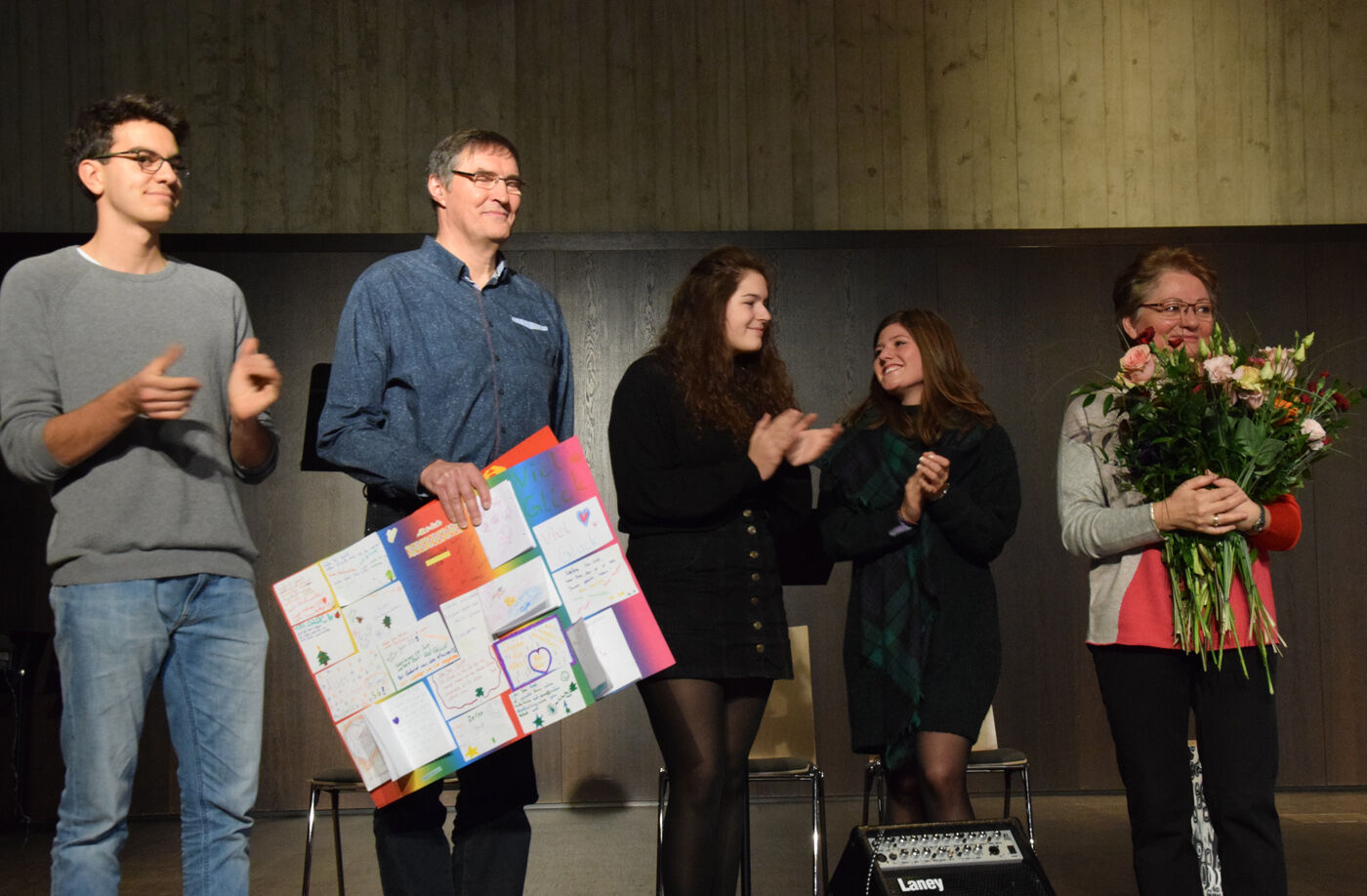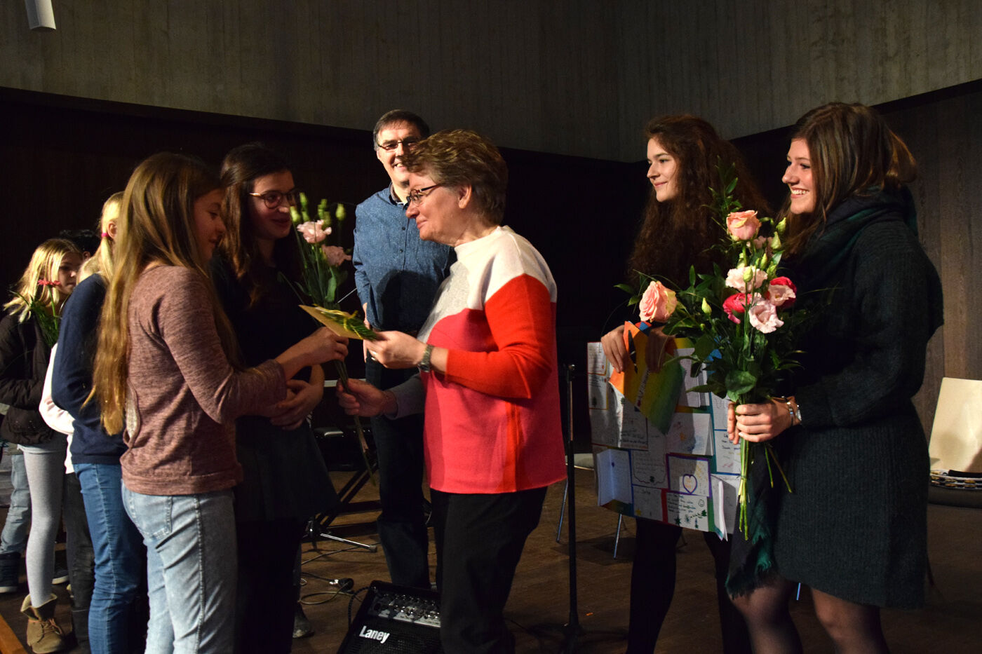 Deshalb bedankte sich die gesamte Schulfamilie für die Arbeit von Annaliese Gross während der letzten 26 Jahre. Gekommen waren natürlich alle Schülerinnen und Schüler, Vertreter des Elternbeirats und des Fördervereins, aber auch mit Ulrika Duetsch und Walter Dietz die ehemaligen Schulleiter des Camerloher-Gymnasiums. „Danke für Ihr großes Engagement. Sie werden uns fehlen“, verabschiedeten die Schülersprecher (Chiara Ecker, Sophie Zeilhofer und Dennis Kerscher) Anneliese Gross: „Wir würden uns sehr freuen, wenn Sie uns künftig bei Konzerten und andern Schulveranstaltungen besuchen würden.“ Die Schülerinnen und Schüler hatten sich für Anneliese Gross eine besondere Überraschung ausgedacht. Jede Klasse übereichte ihr ein von der Klasse gestaltetes kleines oder größeres Plakat mit Unterschriften und eine Rose. Ein sehr emotionaler Moment für die in den Ruhestand gehende Anneliese Gros. Und wie es sich für ein musisches Gymnasium gehört, stimmten alle Schülerinnen und Schüler sowie alle Lehrkräfte am Ende der Verabschiedung den Kanon „Viel Glück und viel Segen an“. sp