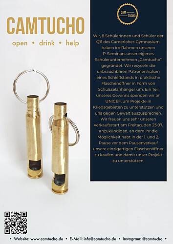 Mit Staatsminister Dr. Florian Herrmann konnte Camtucho – das aktuelle Schülerunternehmen des Camerloher Gymnasiums – einen weiteren prominenten Anteilseigner gewinnen. Die Geschäftsidee – Flaschenöffner in Form von Schlüsselanhängern aus gebrauchten Patronenhülsen zu produzieren und den Gewinn an Kriegsgebiete zu spenden – überzeugte ihn bei der Präsentation im Rahmen einer Videokonferenz am 13. Juli sofort.