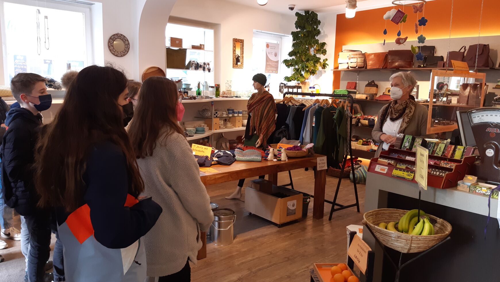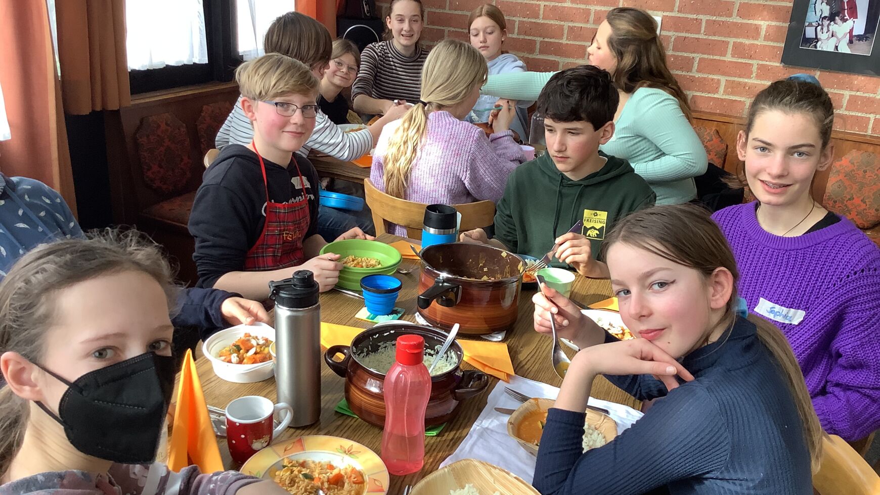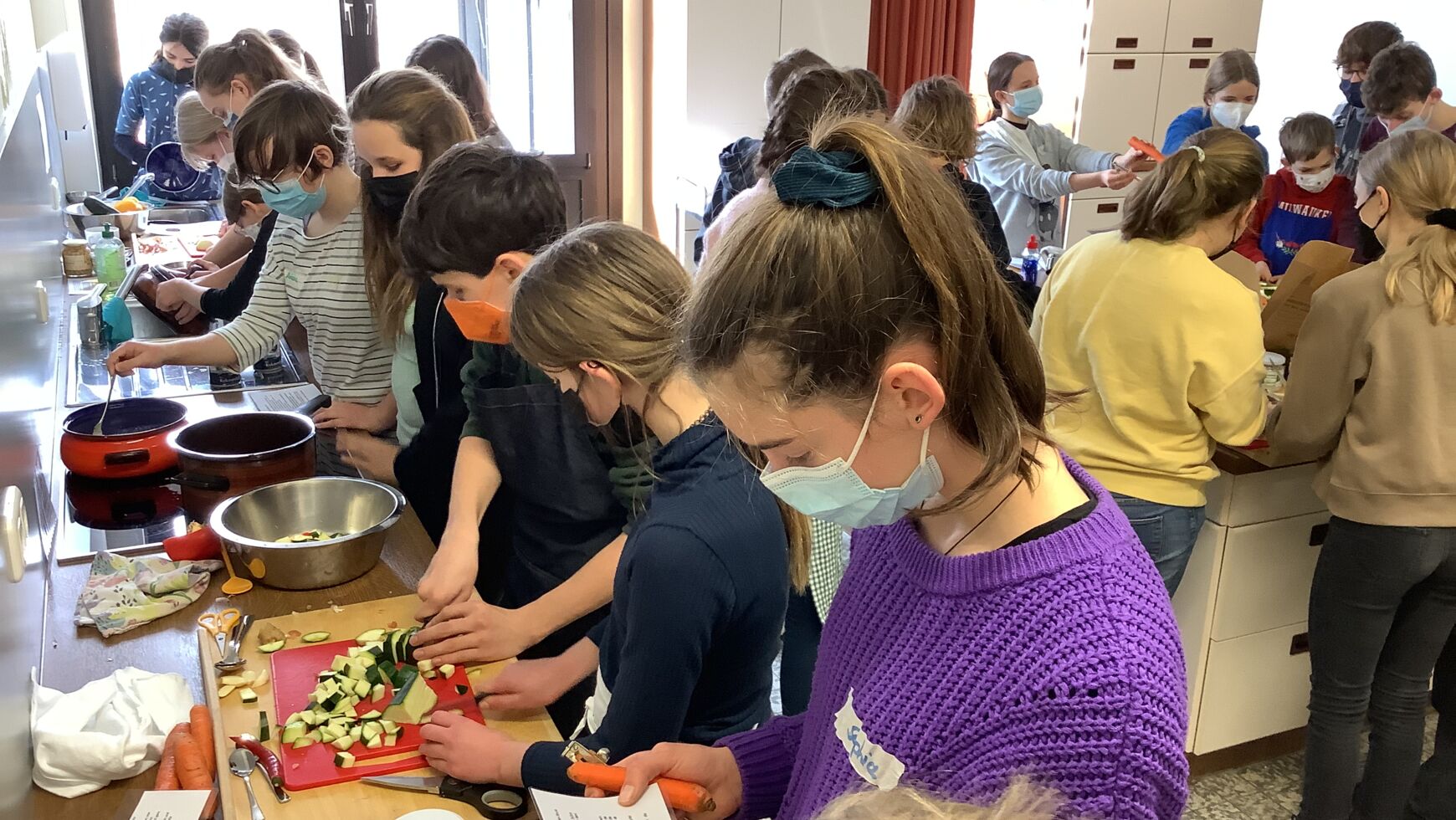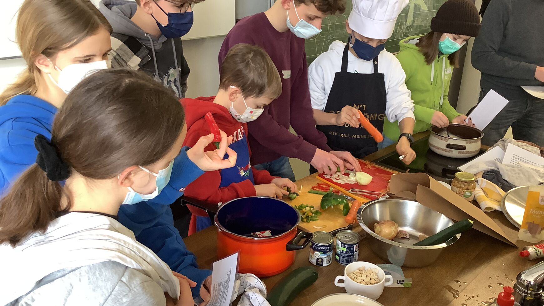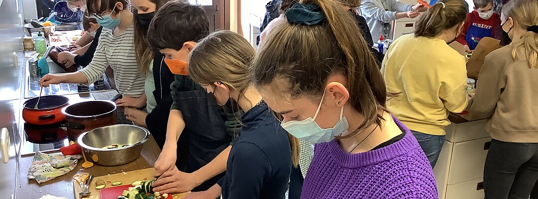 Jede der siebten Klassen durfte an einem der Tage fair kochen. Im Vorfeld lernten die Jugendlichen spielerisch die Prinzipien und Qualitätssiegel des Fairen Handels kennen und erhielten einen Einblick in die Arbeit von Fair-Trade-Organisationen. So wurde beispielsweise untersucht, inwiefern der Faire Handel dazu beiträgt, gerechte Arbeitsbedingungen und Löhne zu garantieren, ausbeuterische Kinderarbeit zu verhindern, Gesundheits- und Bildungsstandards zu verbessern, aber auch Umweltschutz zu fördern und die Rechte von Mädchen und Frauen zu stärken. Dabei wurden so einige Geschichten hinter den fairen Produkten entdeckt. So erfuhren die Schülerinnen und Schüler, dass die Currymischung von Life Earth indirekt Kindern in Uganda Fußbälle verschafft, dass man mit den Mangos von Preda philippinischen Straßenkids in ein geregeltes Leben hineinhilft und dass in Honduras Frauen durch den Cashew-Anbau endlich die Möglichkeit für ein selbstbestimmtes Leben erhalten. Bei einem kleinen Einkaufsbummel in den Freisinger Weltladen führten die Kinder ein Interview mit den dort arbeitenden ehrenamtlichen Mitarbeiterinnen und lernten das bunte Angebot kennen. Von der Schokolade über faire Seife bis hin zu Geschirr und Schmuck kann man hier alles zu einem fairen Preis erhalten. Für den dritten Teil fanden wir herzliche Aufnahme in der Küche der Wirtschaftsschule. Vor den Kochinseln stellten sich nun knifflige Alltagsfragen: Wie koche ich Reis in einem Topf auf dem Herd ohne Anbrennen? Wie gelingt es, Zwiebeln möglichst fein zu würfeln? Wie schäle ich Ingwer? – Alle Rätsel wurden gelöst und am Schluss dampfte ein leckeres, faires und nachhaltiges Curry in den Töpfen, das natürlich zusammen verspeist wurde.