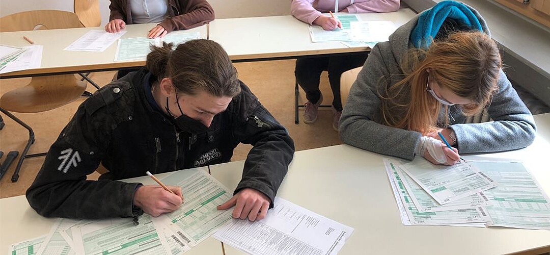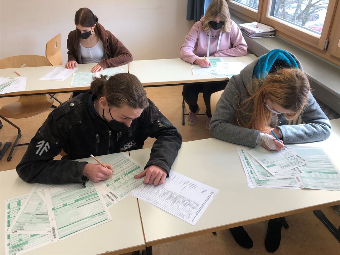 Im Anschluss wurden die Schülerinnen und Schüler ins kalte Wasser geworfen. Sie durften sich anhand von Belegen und echten Steuerformularen zum ersten Mal an einer Einkommensteuererklärung samt Anlagen versuchen. Dass so eine Steuererklärung kein „Zuckerschlecken“ ist, haben die Schülerinnen und Schüler bereits nach wenigen Minuten erkannt. Glücklicherweise wurden sie bei Fragen von unseren beiden Referentinnen unterstützt und die Einkommensteuererklärungen im Anschluss an die Gruppenarbeitsphase „verbessert“.