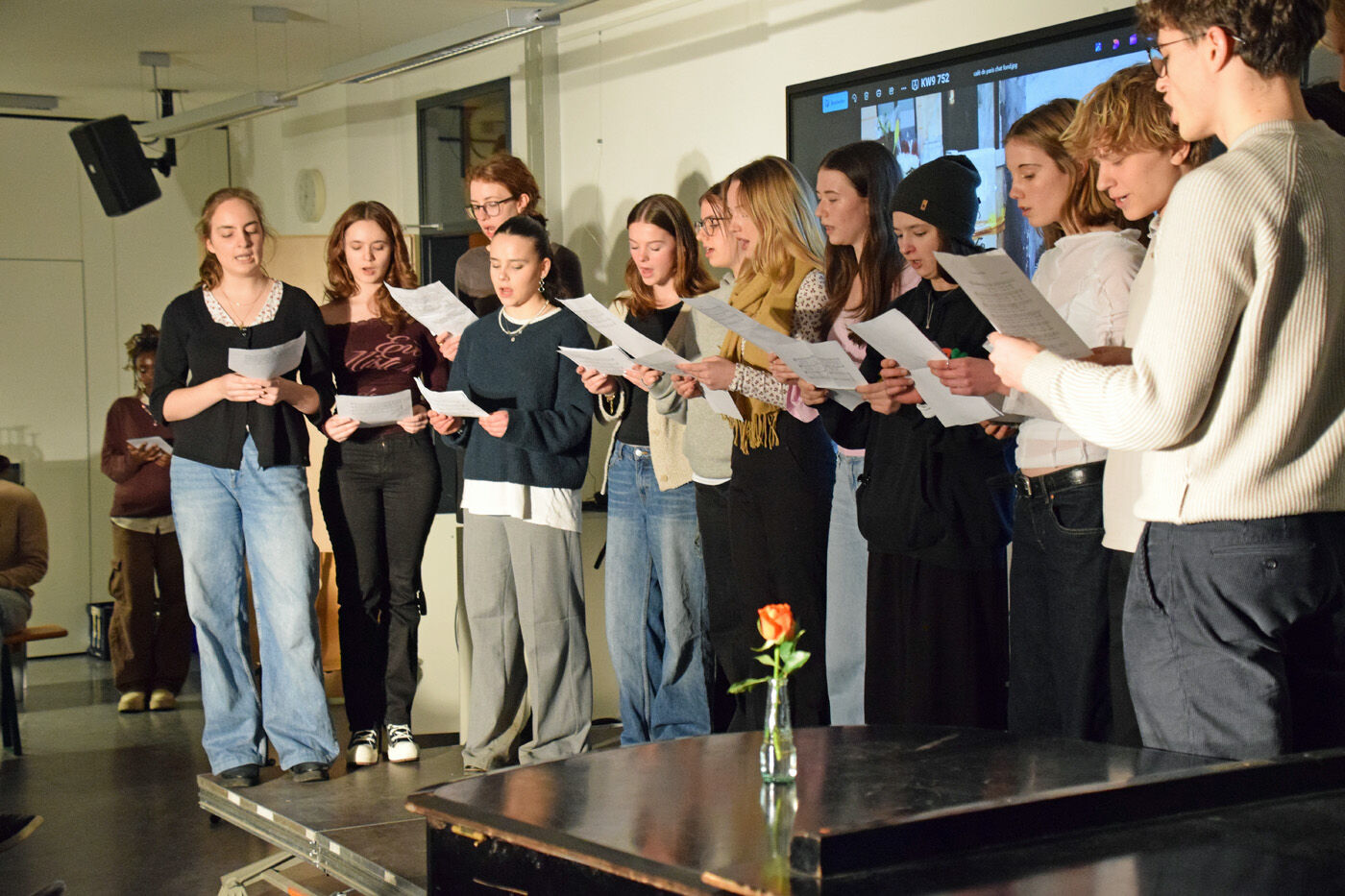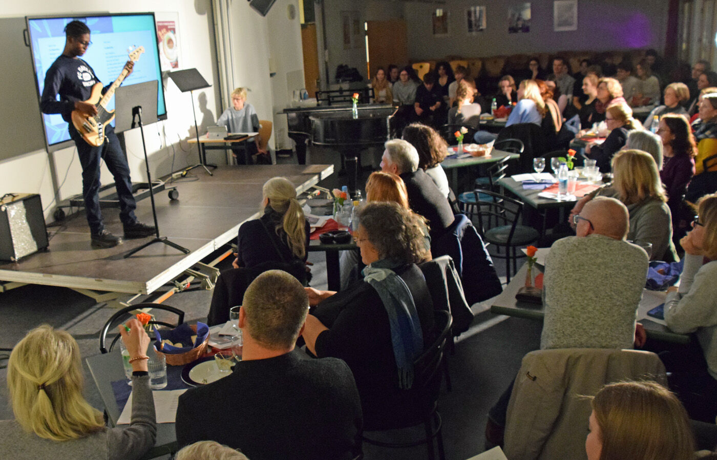Beim Café de Paris zum deutsch-französischen Tag präsentierten die Jugendlichen Frankreich als attraktives Land in Sachen Kunst und Lebensart: ob mit einem gar nicht leicht zu lösenden Quiz, dem Erfahrungsbericht einer Zwölftklässlerin von einem viermonatigen Auslandsaufenthalt in der Bretagne, Fotos und lockeren Erzählungen vom Surfen am Atlantik oder der Entdeckung, dass in Florida dank Disney ein zweites Paris herumsteht. Dass Frankreich und die französischsprachigen Länder auch in Freising vertreten sind, bewies ein kleiner Film, der Vertreter der Francophonie an unserer Schule zu Wort kommen ließ – eine Reinigungskraft aus Togo ebenso wie Jugendliche mit afrikanischen Wurzeln oder eine tunesische Schülerin der Deutschklasse, die zuvor in Kanada gelebt hat. Und wo in Freising das beste Croissant zu haben ist, konnten die Zuschauer bei einer Dégustation mit den Erzeugnissen heimischer Bäckereien herausfinden, bei der das Publikum über das beste Produkt abstimmen durfte. Dazu gab es viel innig intonierte Musik, Klavierstücke von Chopin und Yann Tiersen, klassischen Gesang mit einem Duett von Gabriel Fauré, den alten Eurovision Song Contest Schlager „L’amour est bleu“ sowie ein modernes Chanson von Patrick Watson. Und in Zeiten des gefährdeten Weltfriedens setzten Gedichte des Dichters und Jazz-Trompeters Boris Vian am deutsch-französischen Tag einen besonderen pazifistischen Akzent.