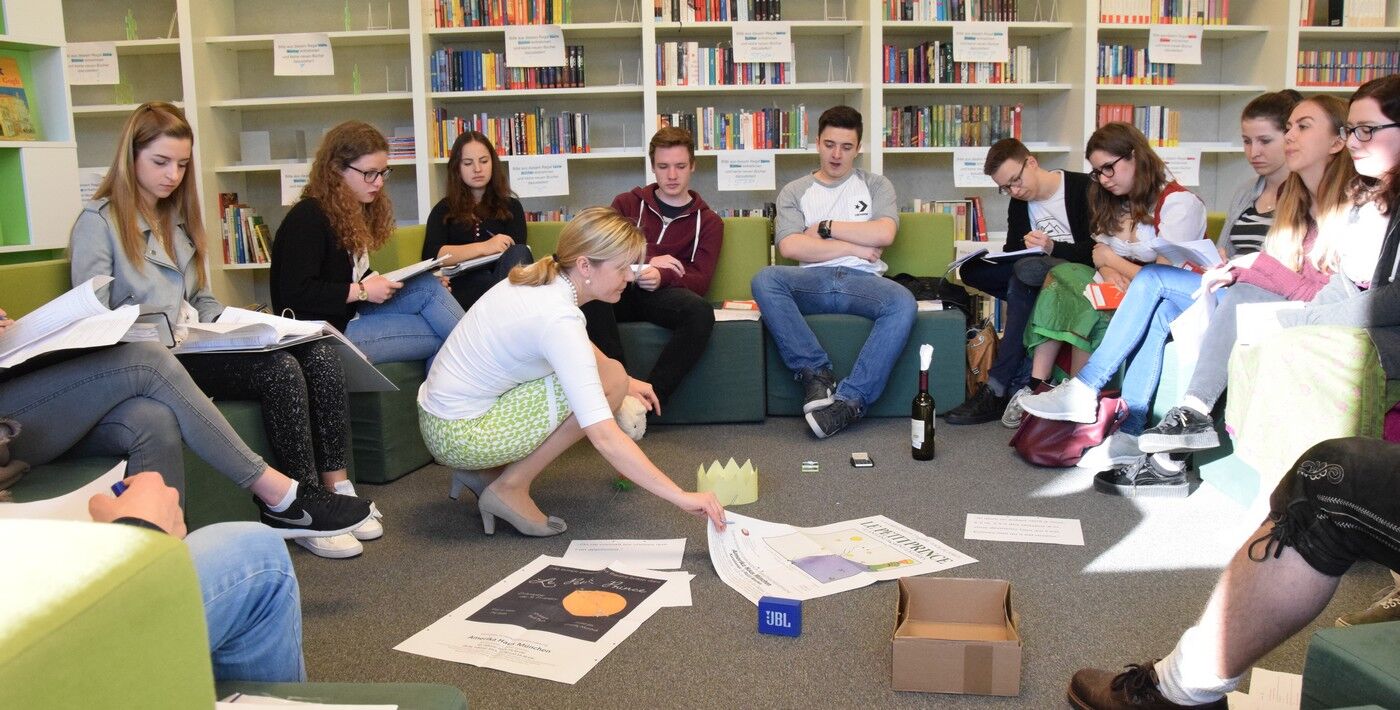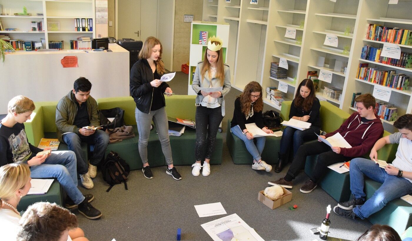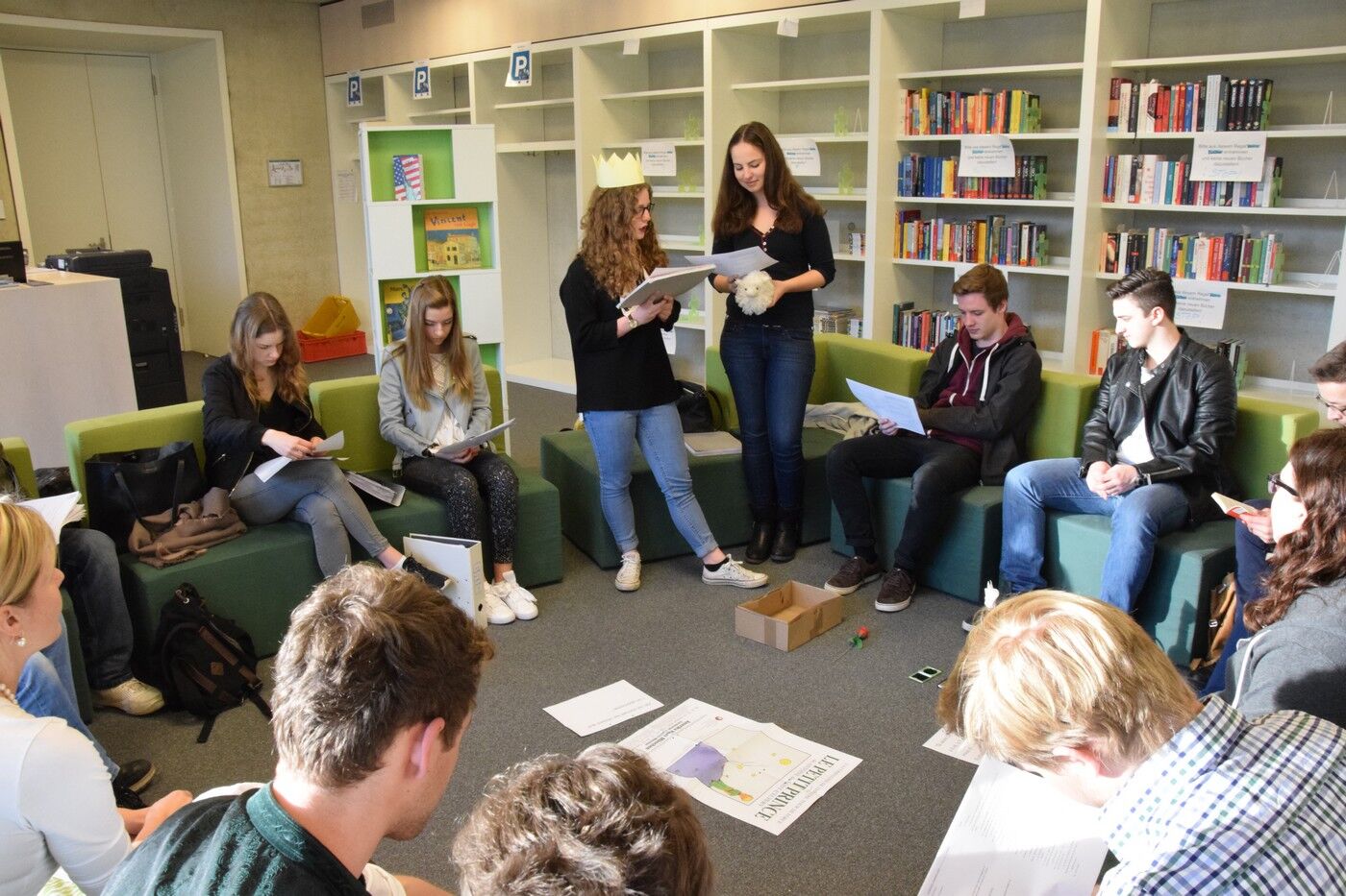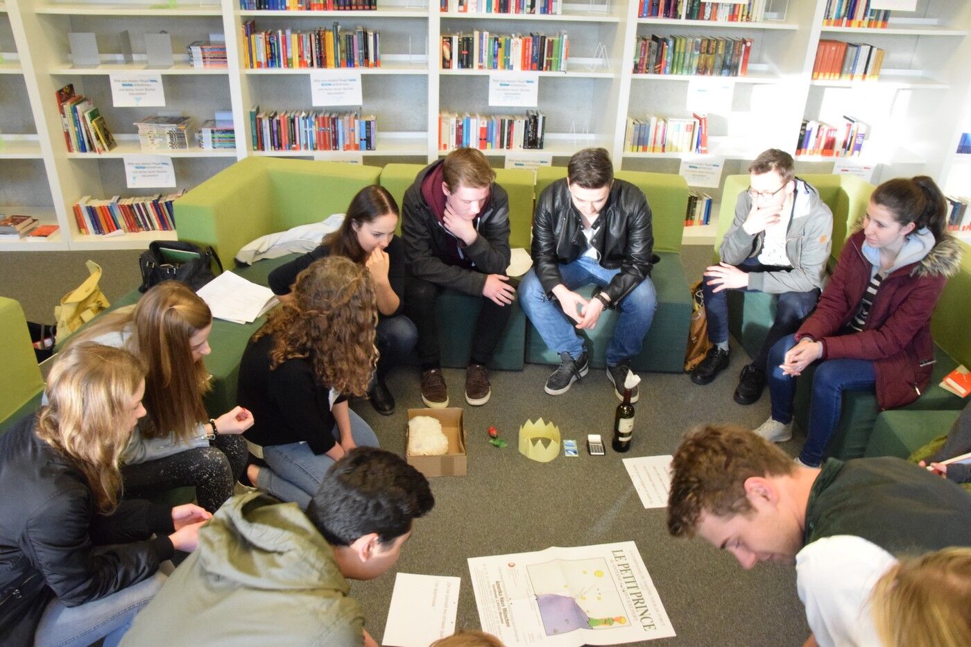 Die Bibliothek bietet neben seinem unkonventionellen Sitzmobiliar, das sich schnell vielseitig umbauen lässt, zugleich viel Platz zum Spiel und zur szenischen Gestaltungdes Gelesenen:Gespielte Dialoge des Kleinen Prinzen mit dem autoritären König oder dem Trinker oder dem eingebildeten Eitlen lassen die Lektüre und damit ihre Kernaussage lebendig werden: Man ist verantwortlich für das, was einem lieb geworden ist. Und weiter: Man muss lernen, das Wesentliche vom Nichtigen zu unterscheiden.Dieses „Wesentliche“ erfährt der kleine Prinz von seinem Freund, dem Fuchs, den er „zähmt“und ihn so zu seinem Freud macht: Der Fuchs wird besonders und einzigartig für den kleinen Prinzen. Diese Geschichte von Liebe und Freundschaft ist eingebettet in eine Rahmenhandlung: Ein Pilot, der in der Wüste Sahara mit seinem Flugzeug abstürzt, erzählt von der wundersamsten und prägendsten Begegnung seines Lebens: In seinen Erinnerungen an den kleinen Prinzen wird alles wieder lebendig: Der kleine Planet des Prinzen, der Asteroid B 612, die ungetrübte Liebe des kleinen Prinzen zu seiner Rose, seine Reise durch den Weltraum und seine Erlebnisse auf der Erde.