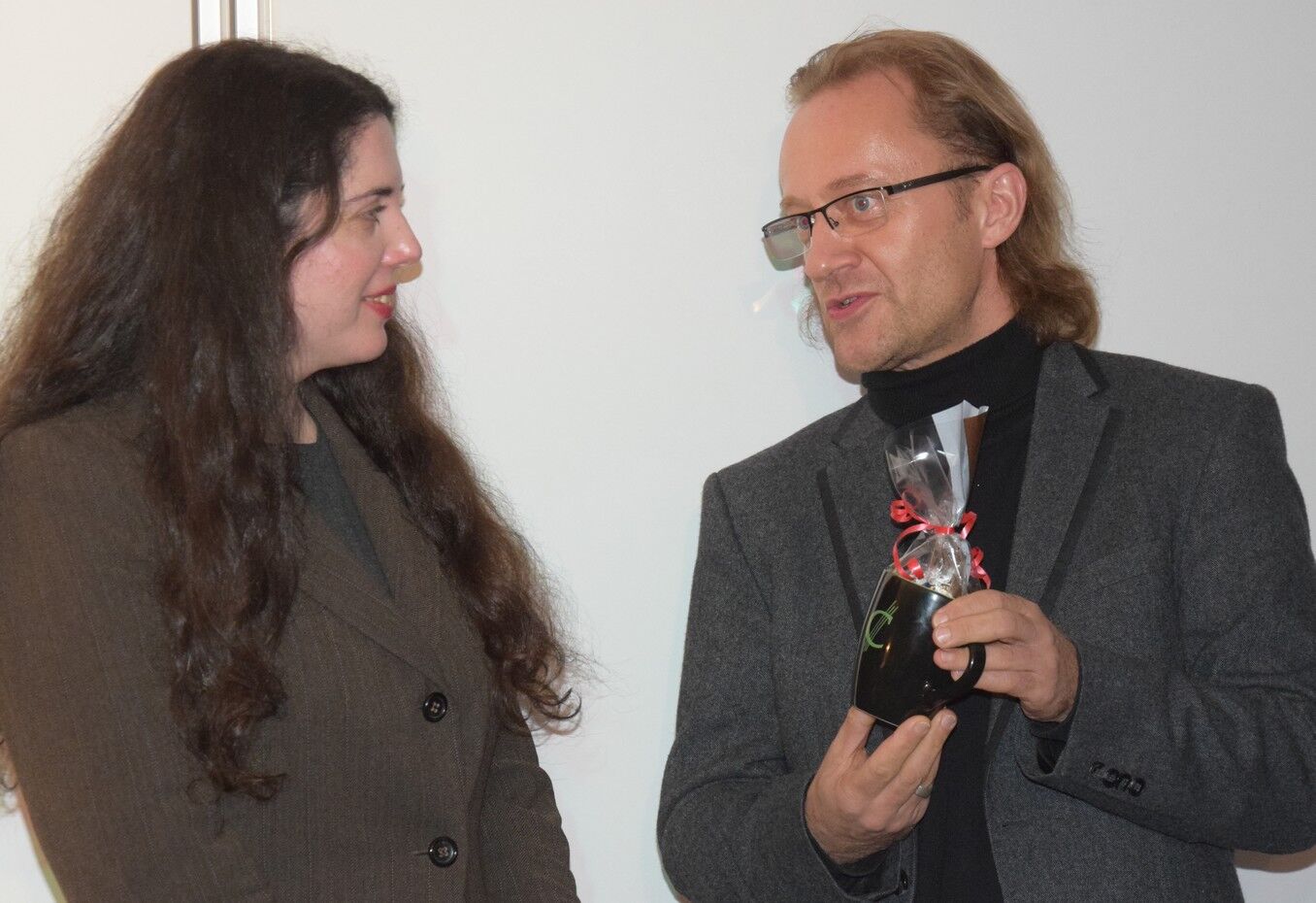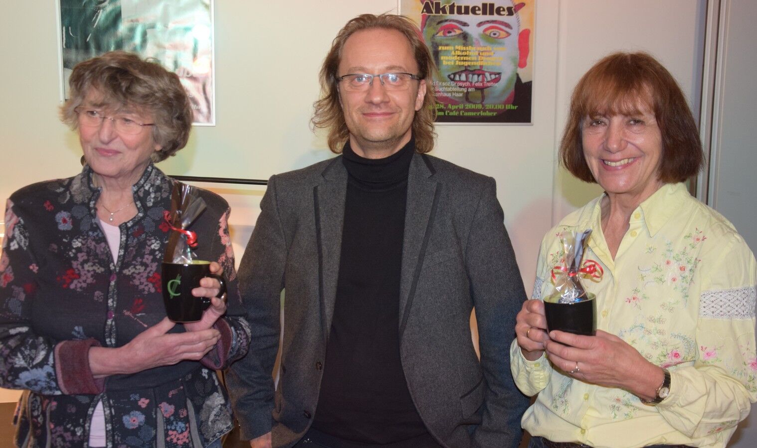 Irmgard Koch und Helma Dietz, die beiden Leiterinnen des modern studions freising bedankten sich beim Camerloher-Gymnasium für die jahrelange Gastfreundschaft beim Literarischen Herbst: „Das ist hier immer ein besonderer Abend, weil stets sehr viele junge Leute kommen.“ Umgekehrt ist die Fachschaft Deutsch des Camerloher-Gymnasiums sehr glücklich, dass das modern studio freising stets ganz außerordentliche und interessante Autoren für die Lesung im Café Camerloher aussucht. Für die langjährige Verbundenheit überreichten die beiden Fachbetreuer Deutsch, Jörg Bauer und Martin Wildgruber, Irmgard Koch und Helma Dietz ein kleines Danke-Schön-Präsent. sp