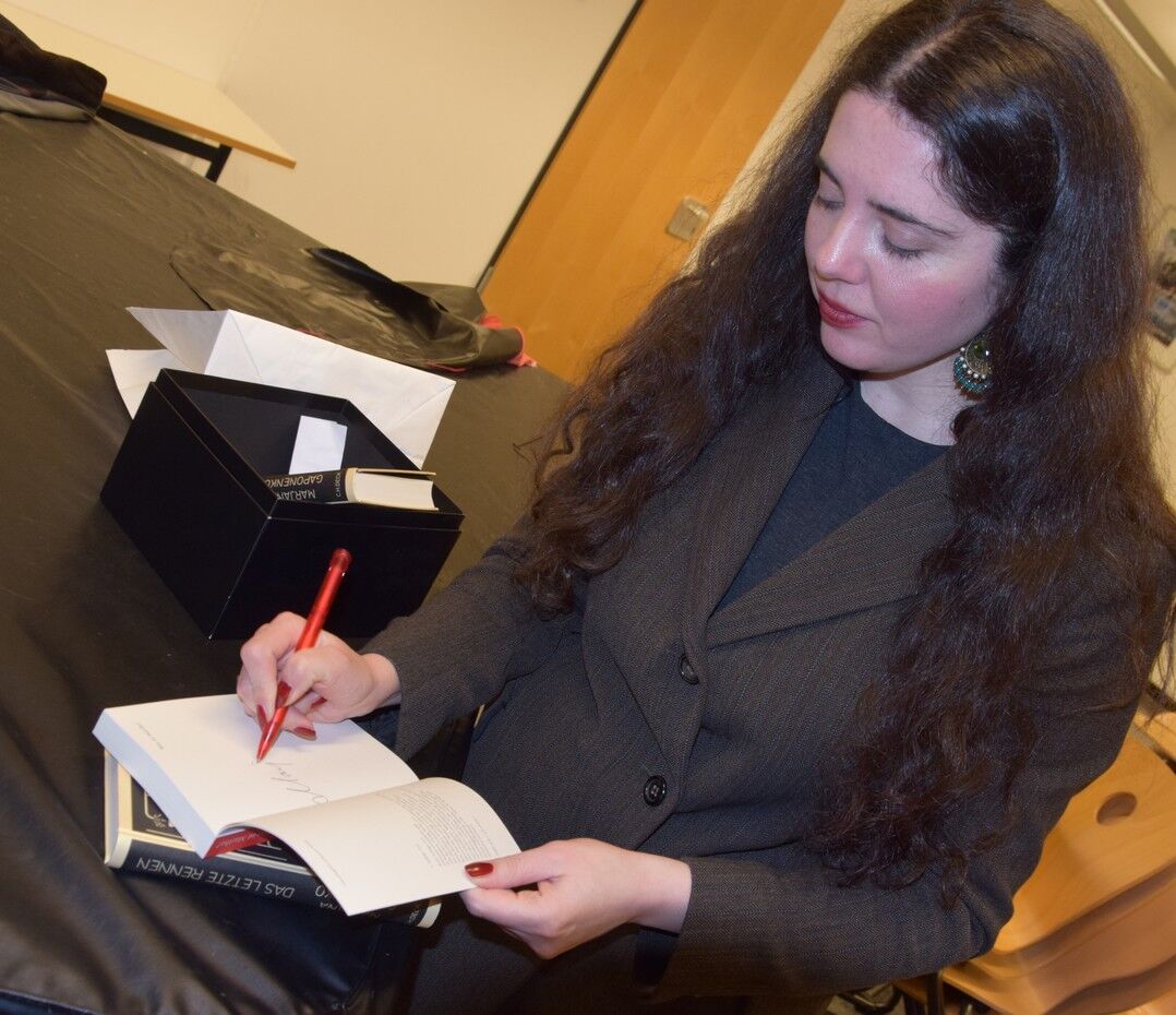 Es wurde im voll besetzten Café Camerloher sofort still, als Marjana Gaponenko, ungemein sympathisch, jung, attraktiv, lange dunkle und gelockte Haare, dezent modisch gekleidet , die kleine Bühne betritt. Sie wirkte im ersten Moment ein klein wenig verunsichert. Lag’s daran, dass so viele Interessierte gekommen waren? „Normalerweise sind bei meinen Lesungen nicht so viele Menschen. Ich bin baff“, sagte sie nach der Lesung. Oder verunsicherte sie der Umstand, dass Menschen aller Altersstufen gekommen waren: vom Oberstufenschüler bis zum Rentner. Mit Blick auf die vielen Schüler – alle waren freiwillig gekommen, versicherten die Deutschlehrkräfte des Camerloher-Gymnasiums – war sich die 36-Jährige, gebürtige Ukrainerin nicht sicher, welche Stellen aus ihrem neuen Roman sie vorlesen sollte. „Bekomme ich von den Lehrkräften grünes Licht, auch Passagen vorzulesen, die im Bordell spielen?“ Natürlich! Marjana Gaponenko unterbrach ihre Lesungen immer wieder, ließ sich auf Assoziationen ein und suchte das Zwiegespräch mit ihrem Publikum.