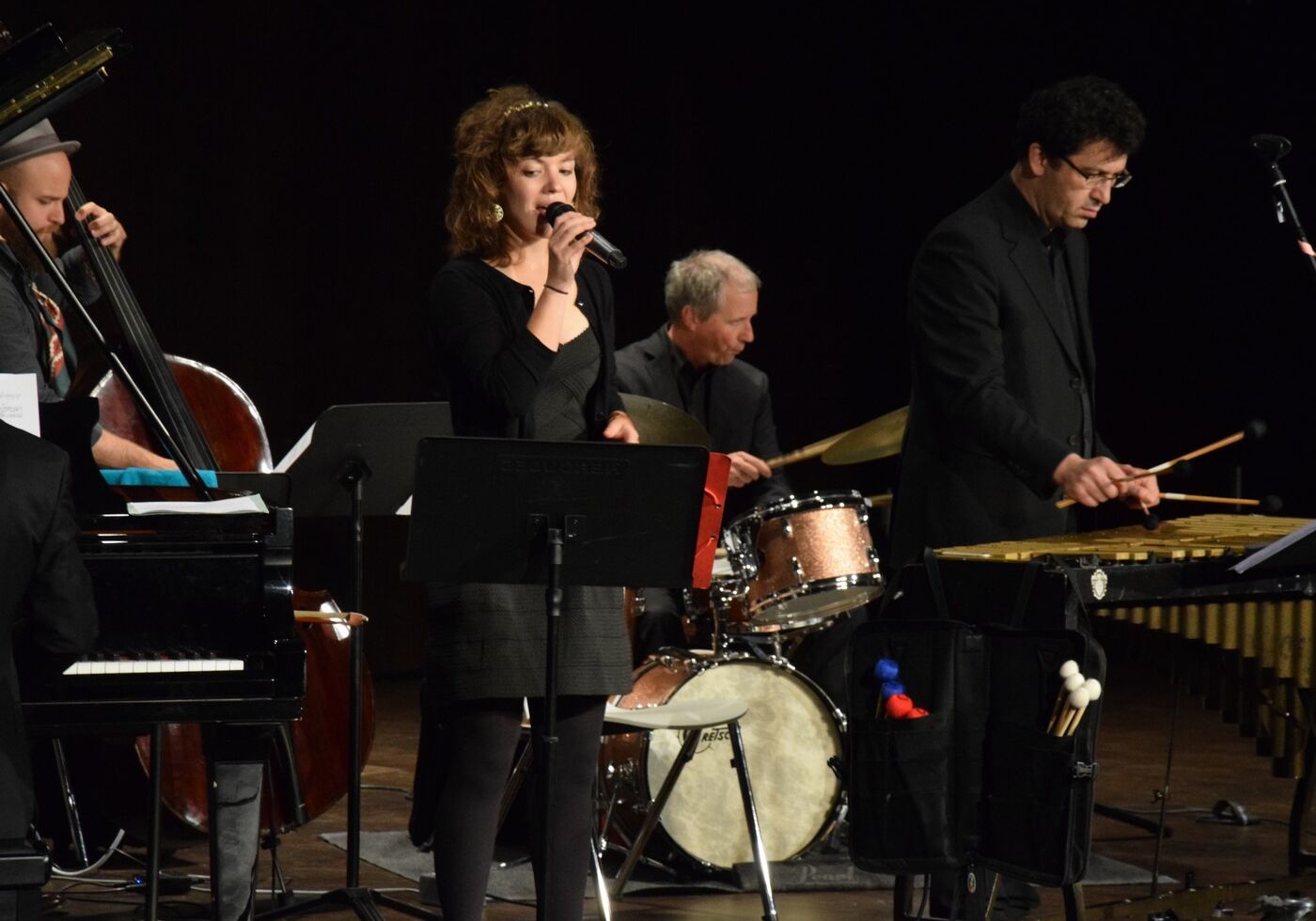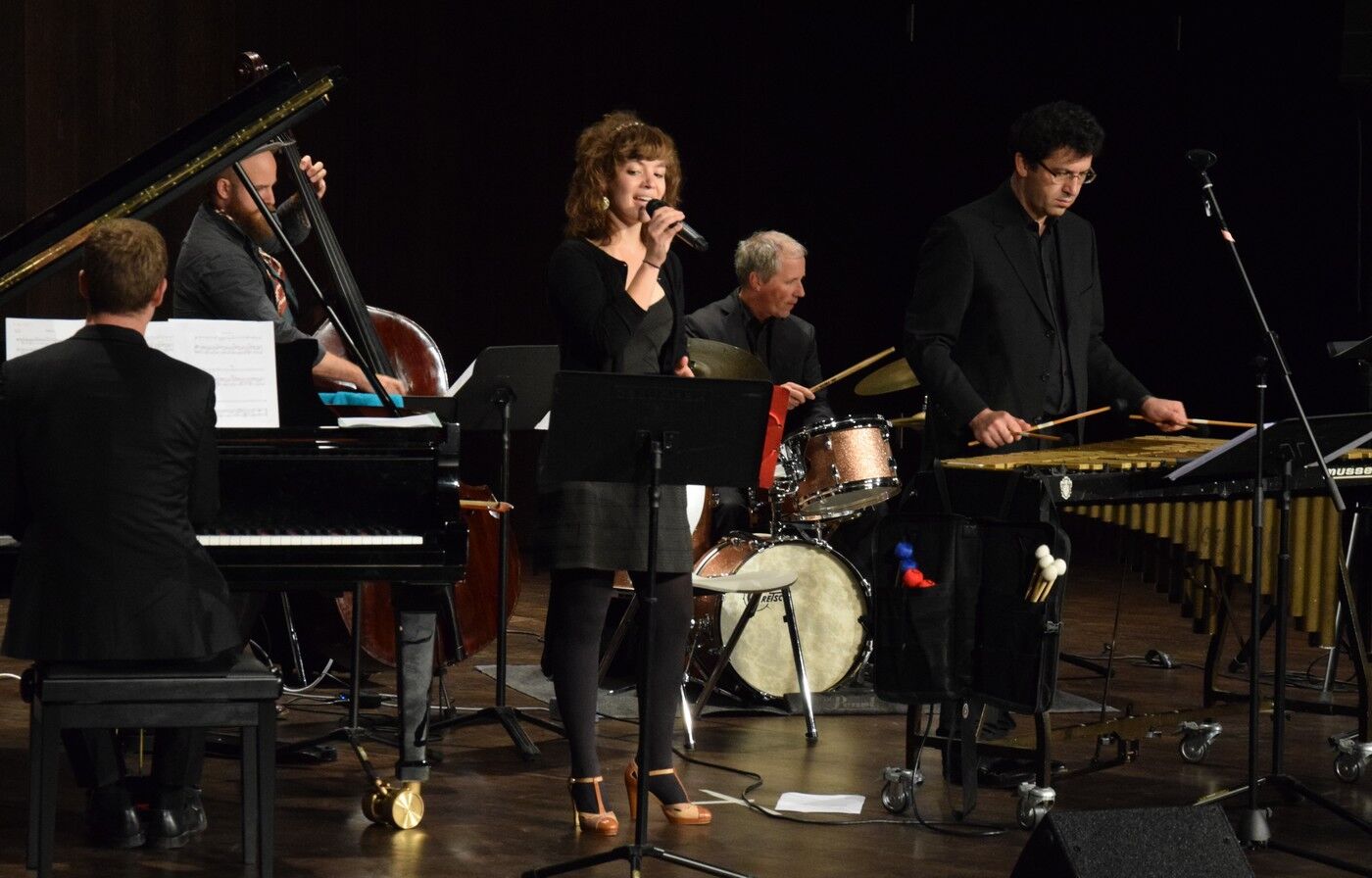 Die fünf Profimusiker, Tizian Jost (Vibraphon), Sarah Mettenleitner (Gesang), Leo Betzl (Klavier), Sven Holscher (Kontrabass) und Michael Keul (Schlagzeug) versuchten nicht die Stücke so zu spielen wie in der NS-Zeit, sondern, wie es im Jazz üblich ist, wurden die Stücke ganz individuelle interpretiert. Vor allem aber ließen die fünf Jazzer ihrer Interpretationsfreude freien Lauf. Das war Jazz vom Feinsten in der Camerloher-Aula, der die Zuhörer immer wieder zum Mitwippen und Mitschnipsen aufforderte. Das war in der NS-Zeit nicht anders. Erstaunlich damals und für viele Zuhörer ganz neu: Auch wenn die Nazis mit aller Macht versuchten, den Jazz, also das Fremde zu verbieten und zu verteufeln, erreichten sie bei vielen Menschen das Gegenteil. Der Jazz genoss in weiten Bereichen der Gesellschaft hohes Ansehen. Die Nazi-Propaganda war dadurch oftmals gezwungen, sich den Jazz so hinzubiegen, dass er in ihre Ideologie passte. sp
