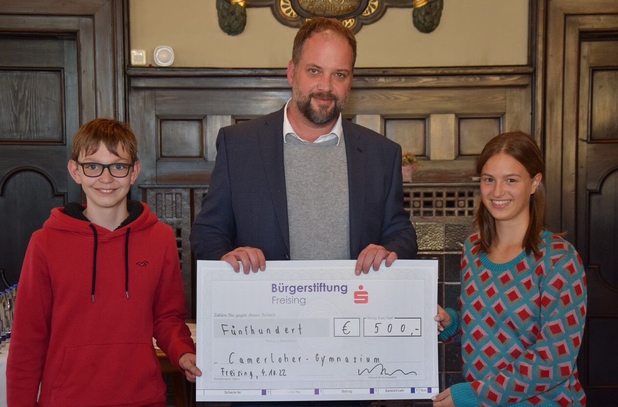 Um die Kosten für die vielfältigen Ausflüge und Unternehmungen ein wenig zu reduzieren, gaben der Lions Club Freising und die Bürgerstiftung Freising eine Finanzspritze. OB Eschenbach überreichte beim Empfang symbolisch an Finlay Halsal, Schüler der Edinburgh Academy, und an Julina Gentz vom Camerloher-Gymnasium einen Scheck. Mit dieser Anschubfinanzierung wollen Lions Club und Bürgerstiftung Freising alle Beteiligten ermutigen, im europäischen Sinne diesen Austausch fortzusetzen. Andrea Bliese (Schulleiterin des Camerloher-Gymnasiums), Elke Balzhäuser und Jonathan McBride von der Edinburgh Academy bedankten sich nicht nur für die Finanzspritze, sondern auch für den herzlichen Empfang bei OB Eschenbacher.