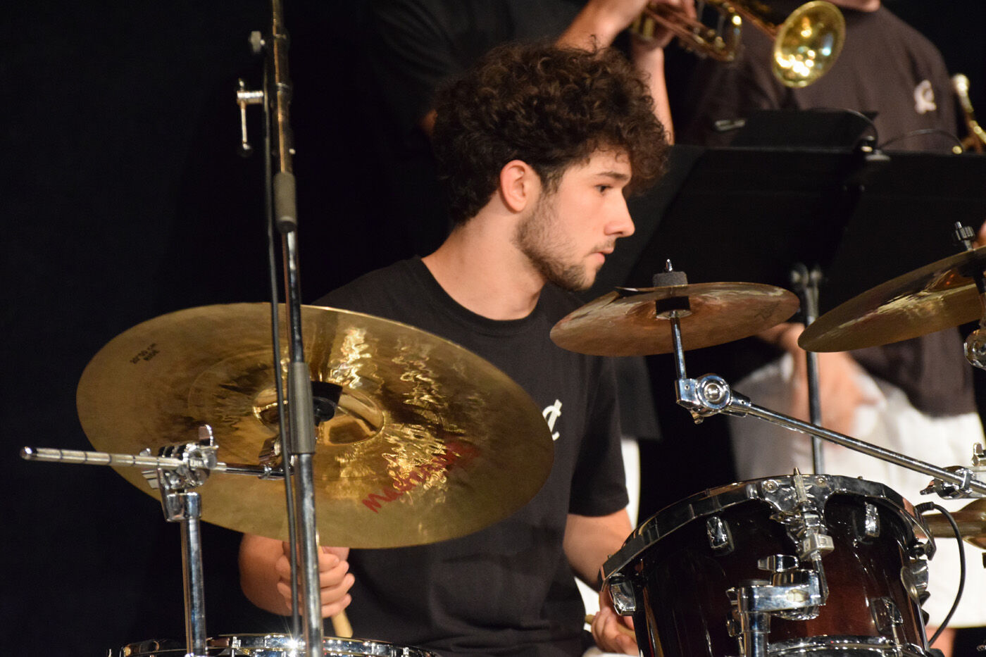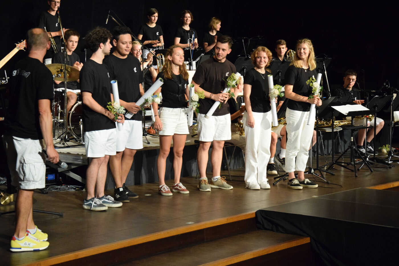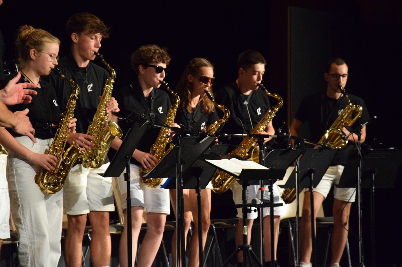 Dabei traten die Schülerinnen und Schüler zum ersten und letzten Mal in der Formation auf, da es sich für etliche Abiturientinnen und Abiturienten bereits um das Abschiedskonzert handelte. Doch nicht nur die Bigband brachte den Konzertsaal in Schwung. Erstmals hatte auch die neu gegründete Junior-Bigband unter der Leitung von Thomas Noichl einen Gastauftritt, der demjenigen „der Großen“ in nichts nachstand. Die jüngeren Schülerinnen und Schüler rockten anderem mit „Final Countdown“ die Aula. Ein Highlight war auch der Auftritt der Combo. Für einen fulminanten Schlusspunkt sorgte eine „erweiterte“ Bigband: Zu dem Konzert wurden auch die ehemaligen Mitglieder der letzten beiden „Corona-Jahre“ eingeladen. Zahlreiche waren dem Ruf gefolgt und spielten das Finale mit. Wie es gute Tradition ist, führte ein ehemaliges Mitglied der Bigband – heuer Florian Appold - durch den Abend.