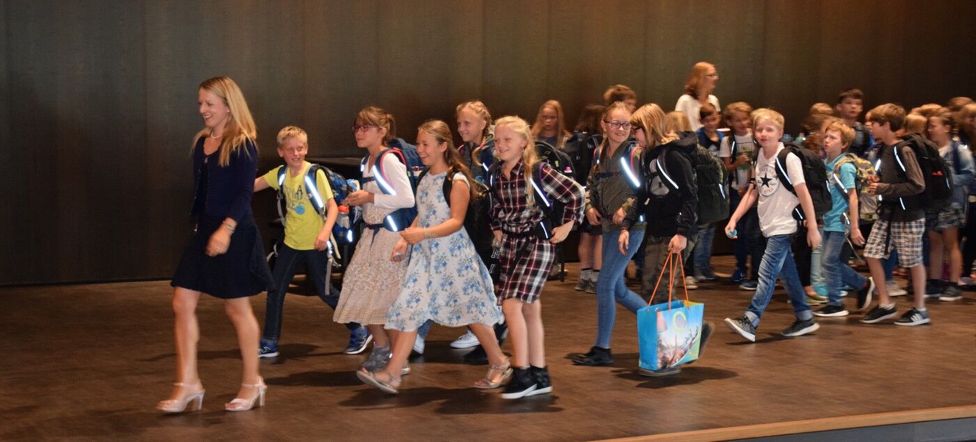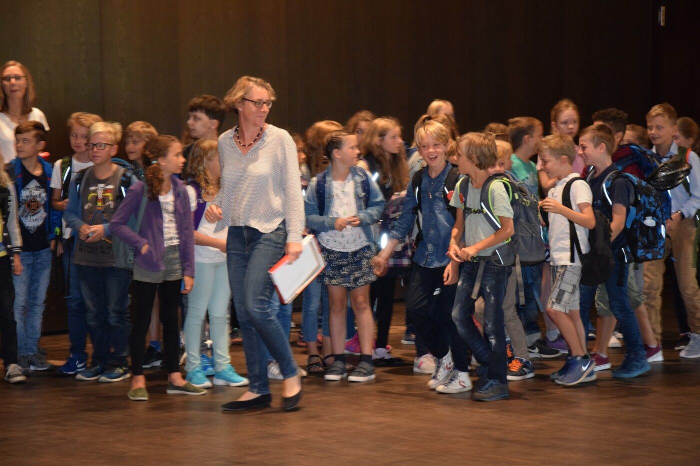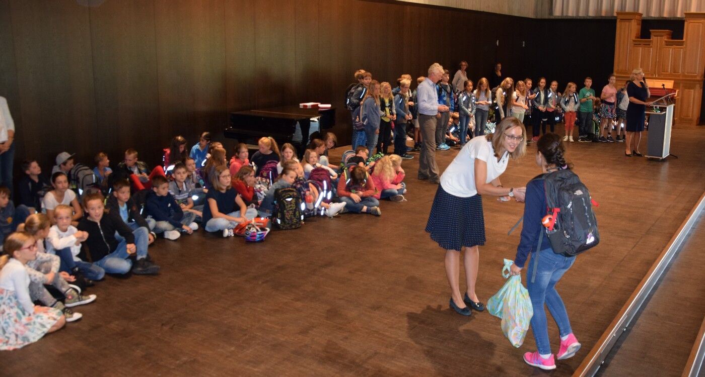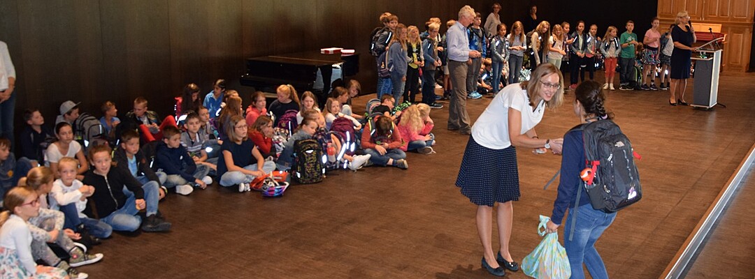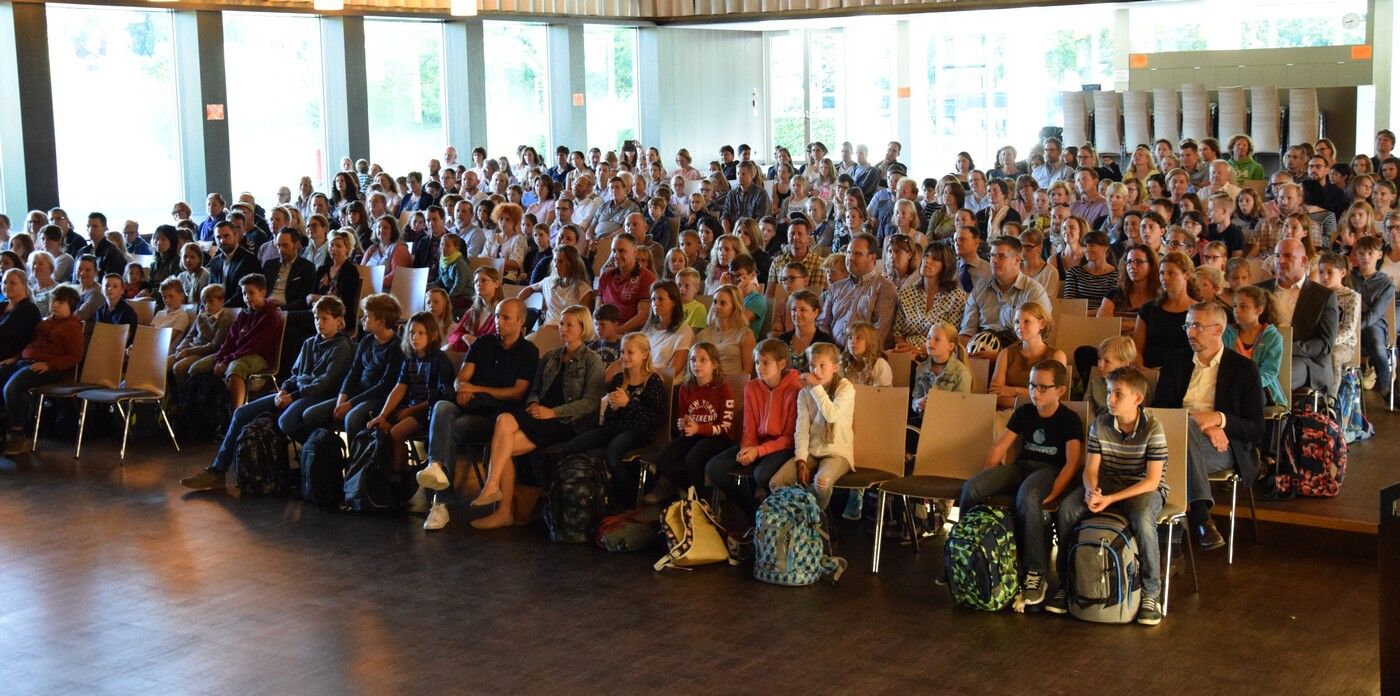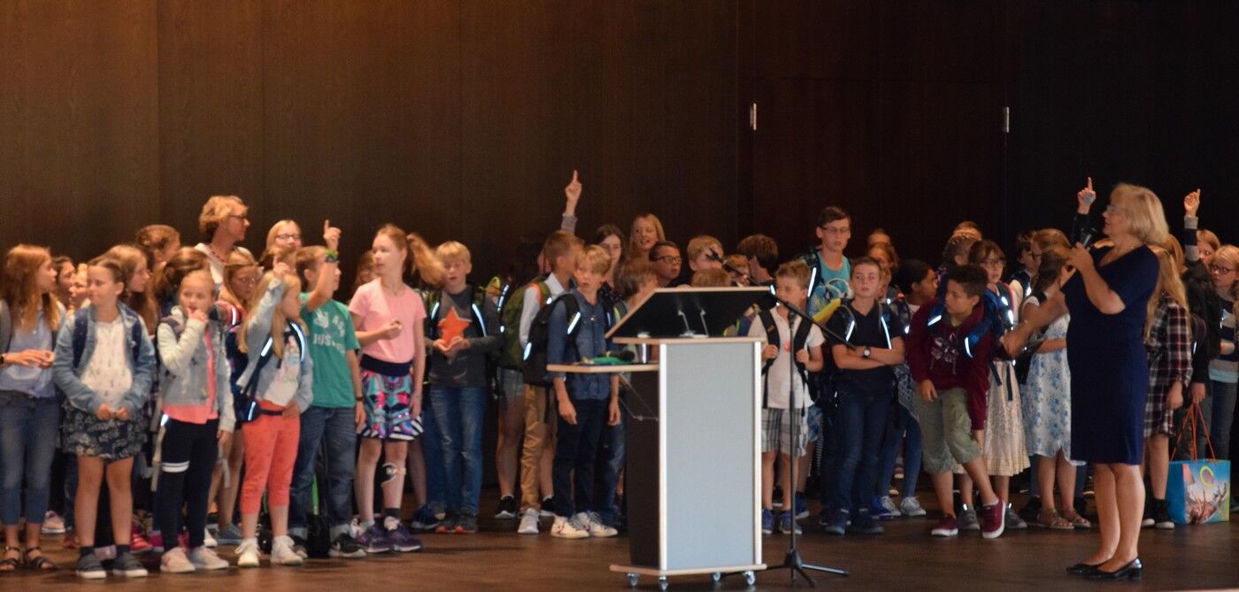 Im Laufe eines Schuljahres kommt es nicht so häufig vor, dass die Musiklehrer für die Schülerinnen und Schüler musizieren. Der erste Schultag für die neuen Fünftklassler ist aber so ein Tag. Birgit Brennich und Gunther Fendler sorgten für die musikalische Begrüßung am Dienstagvormittag. Schulleiterin Andrea Bliese freute sich, neben die 124 Schülerinnen und Schüler, auch sehr viele Eltern begrüßen zu können. Drei mutige Mädchen und drei mutige Buben wagten sich auf die große zum kleinen Quizz mit ihrer neuen Schulleiterin. Sie wollte von den Schülerinnen und Schülern beispielsweise wissen, warum sie sich das Camerloher-Gymnasium ausgesucht hätten oder was auf sie Neues zukomme und was sich im Vergleich zur Grundschule verändern werde. Die Freude am Musizieren stand bei den Neuen ganz oben als Begründung. Sie waren sich auch sicher, dass alles im Unterricht schwerer werden würde, dem freilich Andrea Bliese nicht ganz zustimmen konnte. „So viel schwerer wird nicht“, beruhigte die Schulleiterin die Schülerinnen und Schüler.