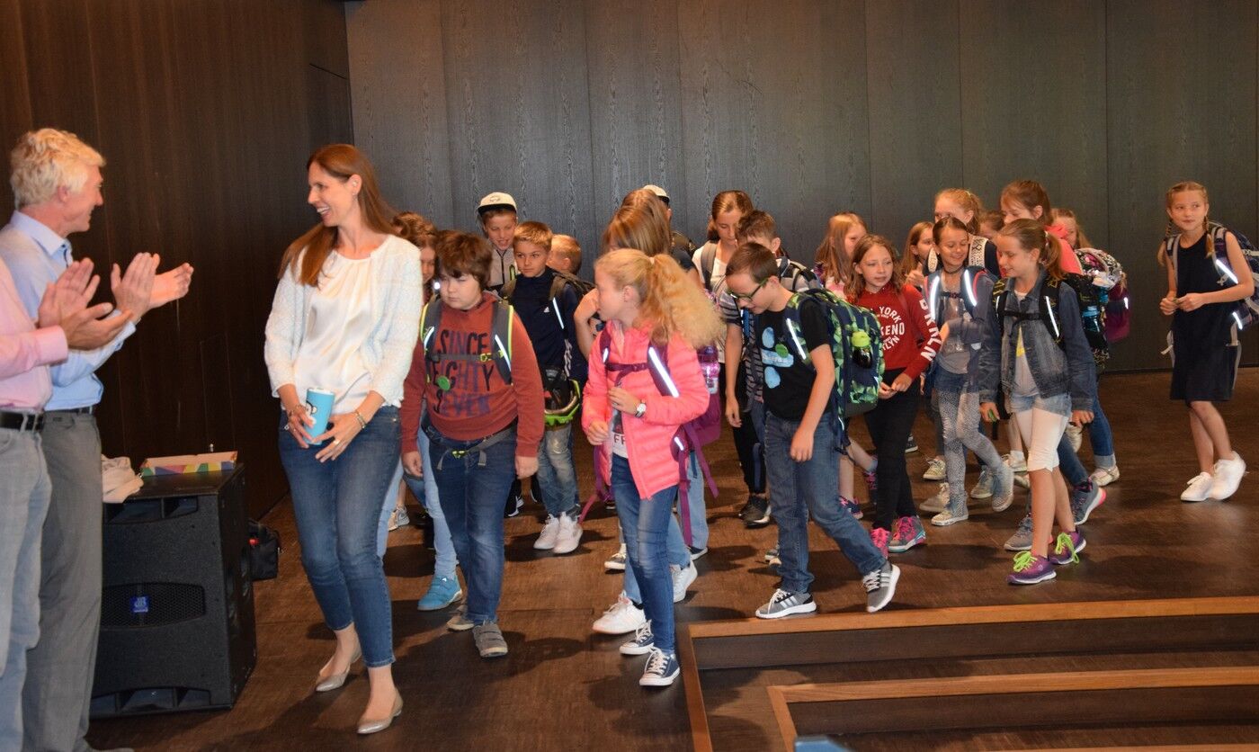 Nach dieser ersten kleinen Rundereise durch das Schulleben am Camerloher begrüßten die jeweiligen Klassenleiterinnen jeden einzelnen Neuen und überreichten jedem einen Namensbutton. Damit waren die Kinder offiziell in die Schulgemeinschaft aufgenommen. Ein kurzes Winken Richtung Eltern, und dann machten sich strahlende Fünftklasser zusammen mit ihren Klassenleiterin auf den Weg zu ihren neuen Klassenzimmer.