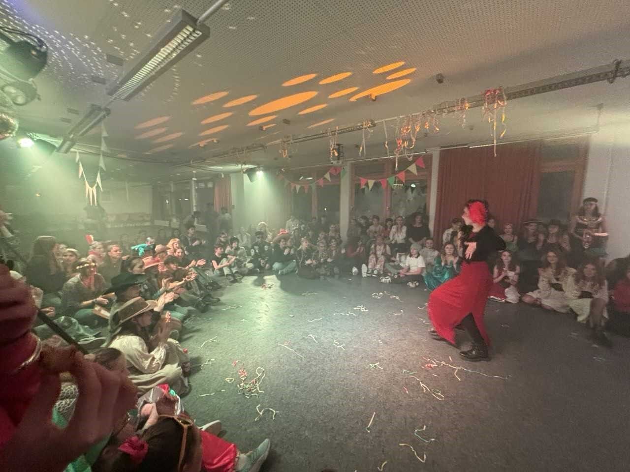 Am Freitag war mit zwei Aktionen der Höhepunkt der Woche. In der ersten und zweiten Pause haben wir Krapfen verkauft. Einige hatten jedoch nicht so Glück mit ihrer Krapfen-Füllung, haben für ihren Senfkrapfen aber einen Pausenverkaufsgutschein sowie einen neuen Krapfen erhalten. Am Abend wurde im Mehrzweckraum mit den 6. bis 9. Klassen Fasching gefeiert. Zwischen Essen, Kostümwettbewerb und Tanzen traten auch zwei Garden auf, die für Stimmung sorgten.