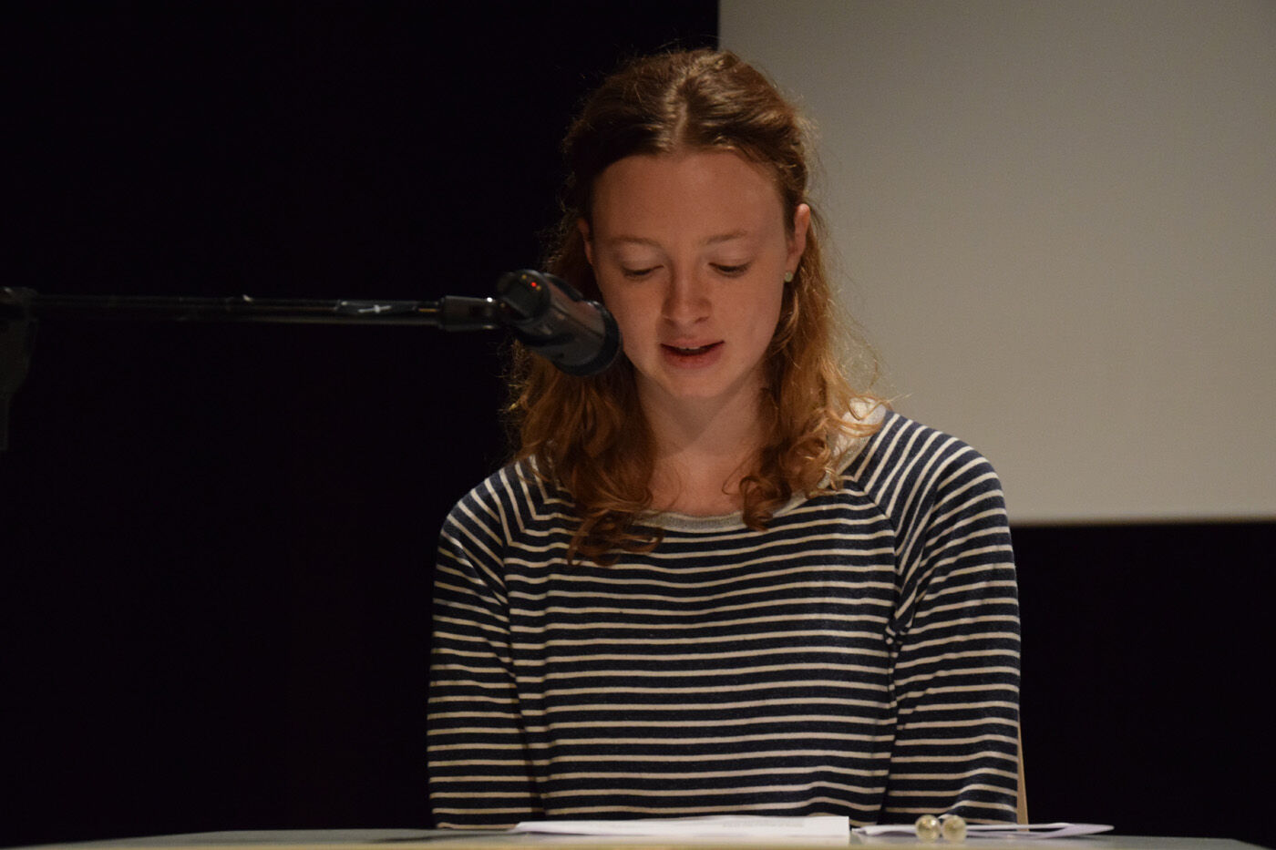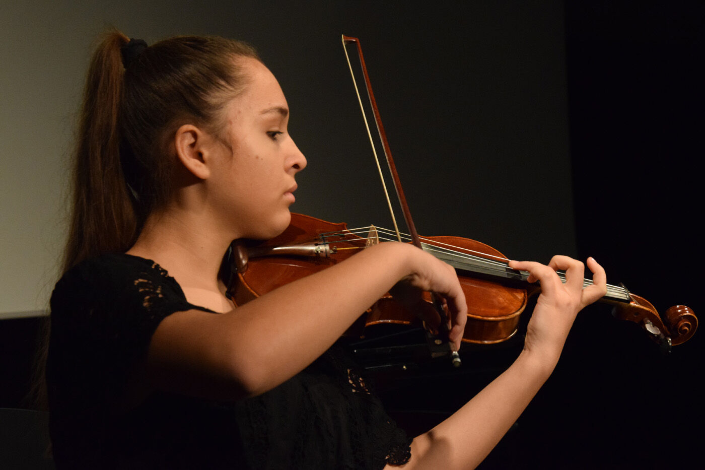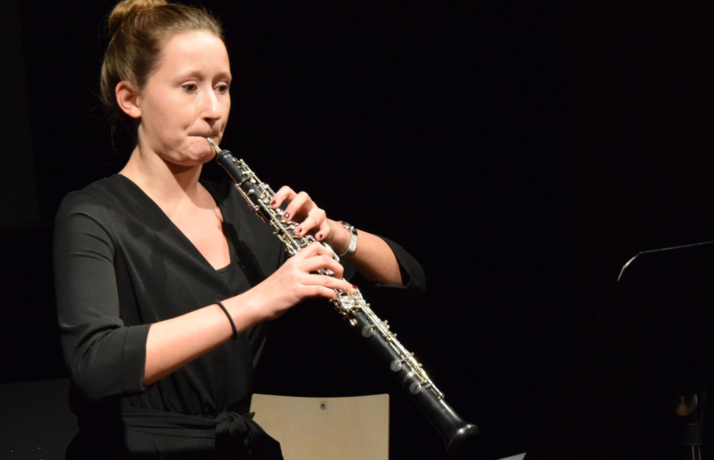 In der Tat präsentierten die Schülerinnen und Schüler, von der fünften Jahrgangsstufe bis zur zwölften, sehr anspruchsvolle Stücke, die aufgrund ihrer Thematik manchmal unter die Haut gingen. Das war beispielsweise bei Ilse Webers Lied „Ich wandere durch Theresienstadt“, gesungen von Miriam Fußeder (Sopran), der Fall. Es dauerte einige Zeit, bis das Publikum es wagte zu applaudieren, um danach in der Pause genügend Zeit zu haben, dieses Lied zu verarbeiten.