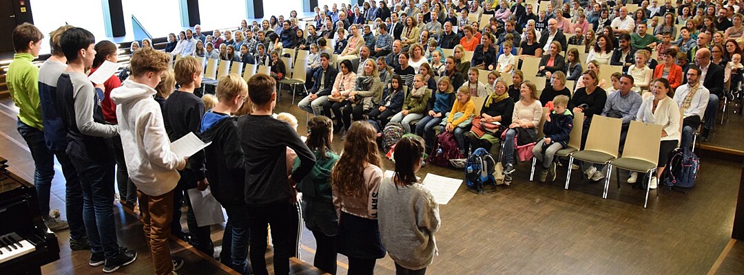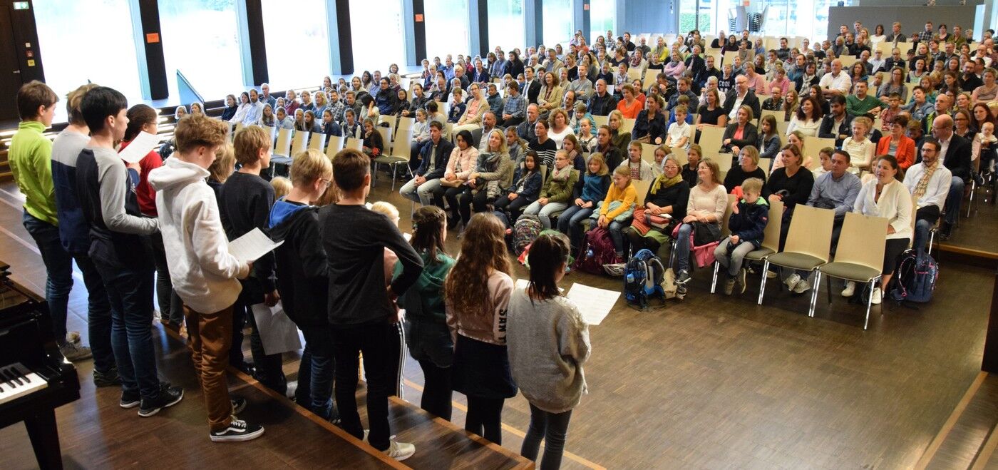 Es ist für alle, also für die Schülerinnen und Schüler, die Eltern und die Lehrkräfte, ein ganz besonderer Tag, wenn sich die „Neuen“ in der Aula versammeln und das erste Mal so richtig und offiziell Camerloher-Luft schnuppern dürfen, also richtige Gymnasiasten sind. Für den Auftakt hatte die Klasse 6e unter der Leitung von Friederike Eglhuber ein Begrüßungslied vorbereitet. Danach hieß Schulleiterin alle herzlich willkommen. „Ihr gehört jetzt zu uns“, sagte Andrea Bliese. „Ihr habt euch entschieden, auf welche Schule ihr wechselt wollt.“ Die Schulleiterin wollte wissen, wer ein mulmiges Gefühl habe. Deutlich mehr Eltern als die Kinder, so die Antwort. Dass die Schülerinnen und Schüler offensichtlich ihrem ersten Schultag am Gymnasium recht entspannt entgegenblickten, sah man auch daran, dass sich gleich zehn ganz Mutige fanden, die zur Schulleiterin auf die Bühne kamen, um sich vorzustellen und viele Fragen zu beantworten. Sie wussten, was sich alles im Vergleich zur Grundschule ändern wird: viele neue Fächer, darunter Latein, in jedem Fach eine andere Lehrkraft, ein viel größeres Schulhaus und natürlich ein neuer Schulweg