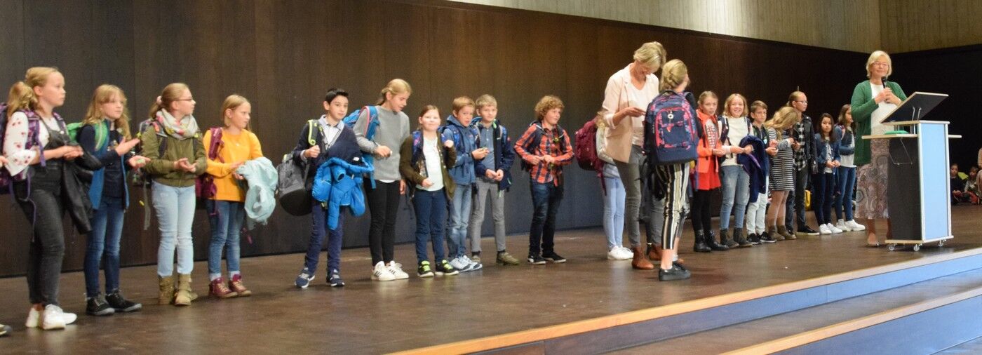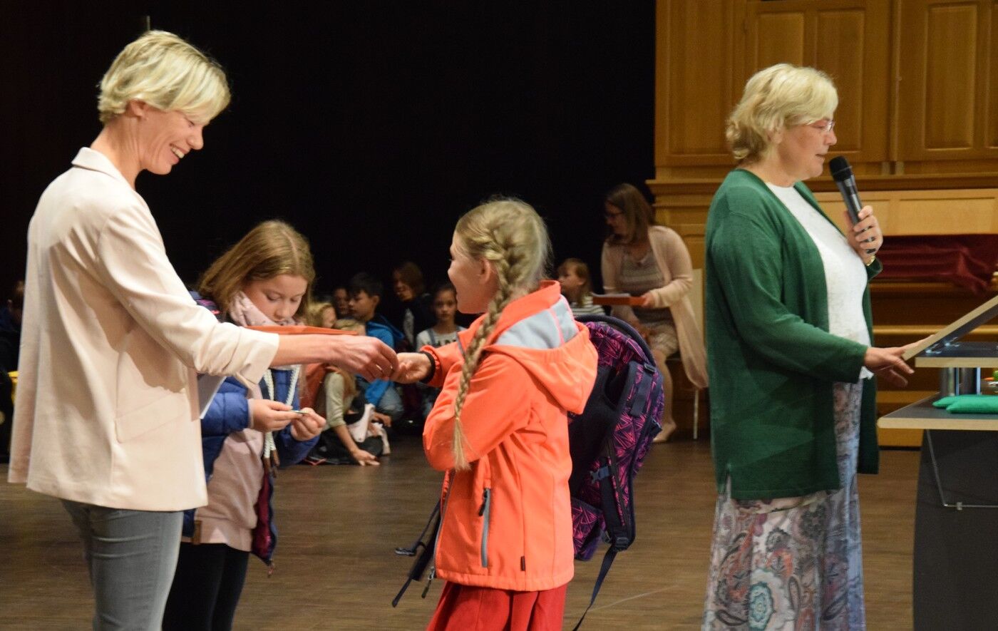 Jede neue Schülerin und jeder neue Schüler erhielt dann aus den Händen der jeweiligen Klassenleitung einen Namensbutton ausgehändigt. Und dann ging’s schon ab ins Klassenzimmer und die Eltern blieben allein in der Aula zurück, um von der Schulleiterin noch einige wichtige Informationen zu erhalten.
