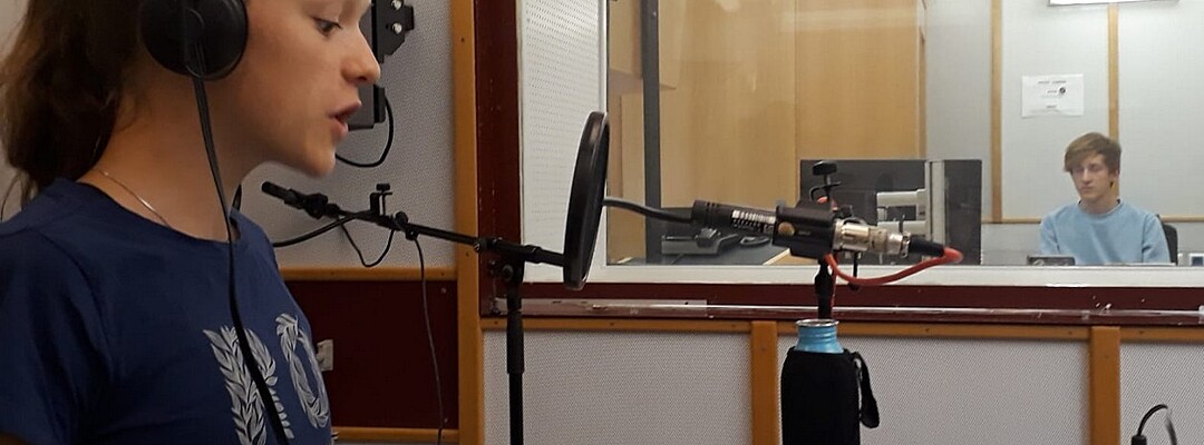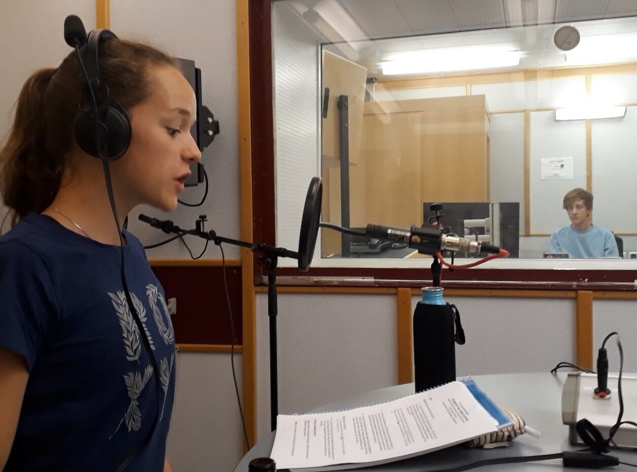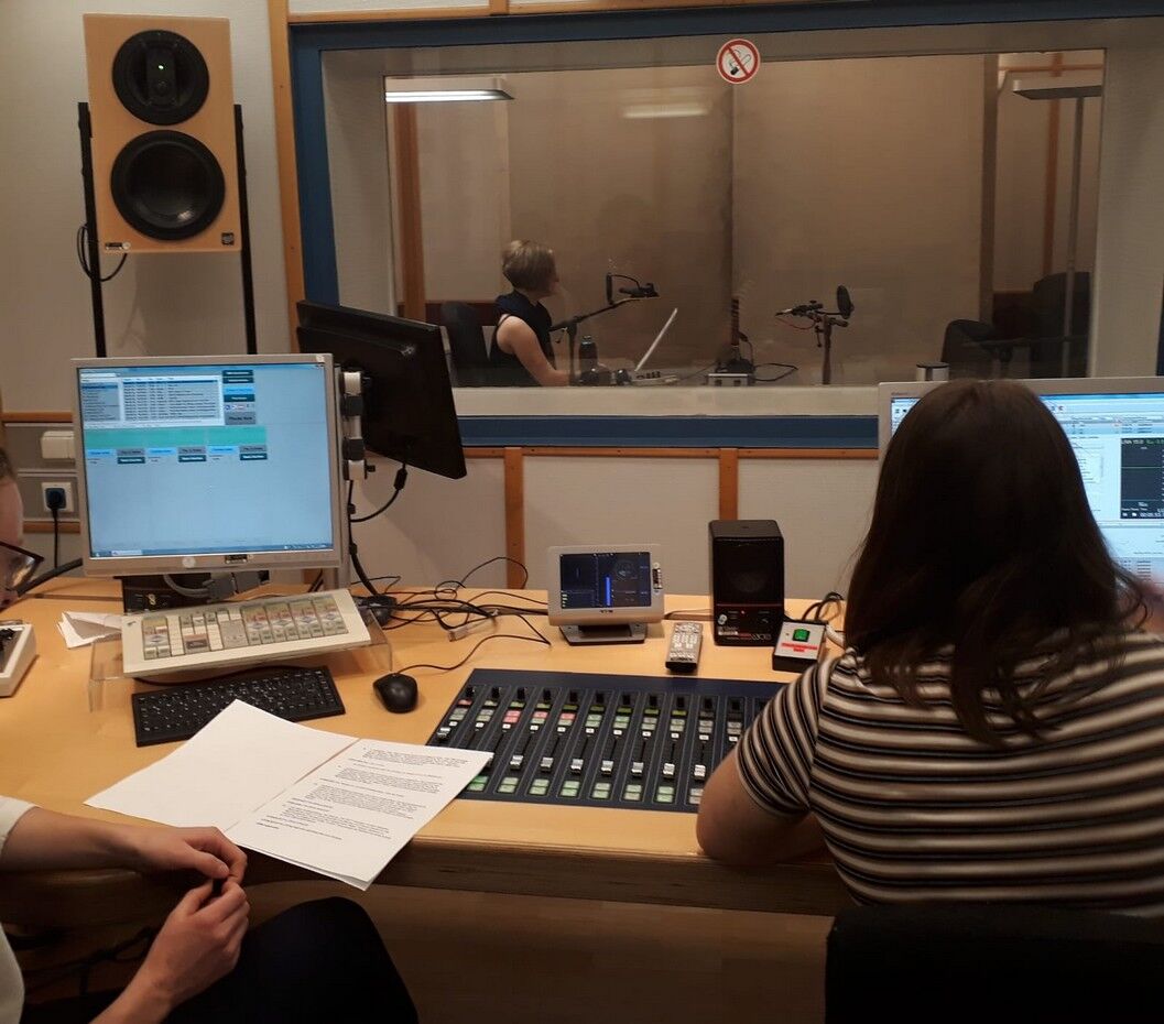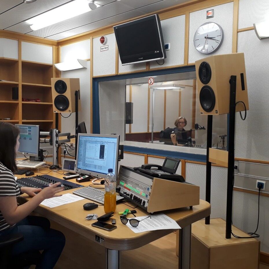 „Oh, hier ist aber wenig Tageslicht.“ „Ah, das hier ist die Sprecherkabine.“ – Eileens Arbeitsplatz weckte nicht nur unser Interesse, sondern bot uns auch sehr professionelle Möglichkeiten der Tonaufnahme und -bearbeitung.