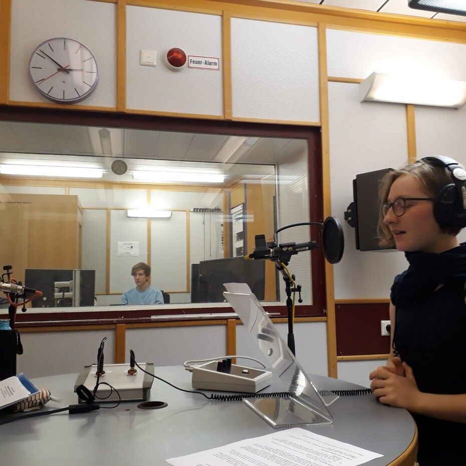 Am 06.06.2019 schnitten wir hier einen Tag lang die O-Töne, feilten am Skript, suchten aus dem BR-Archiv Geräusche zum Unterlegen der Zitate und durften in der Sprecherkabine die Texte einsprechen. Diverse Vorübungen mit Trinkflaschenverschluss und Gurkenscheiben zwischen den Schneidezähnen sorgten für viel Heiterkeit und letztlich gute Aufnahmen! Nachdem Eileen noch alle O-Töne „geputzt“, d.h. von „Ähs“ und „Mmhs“ befreit hatte, kombinierten wir alle Einzelteile zu einem fünfminütigen Hörstück.