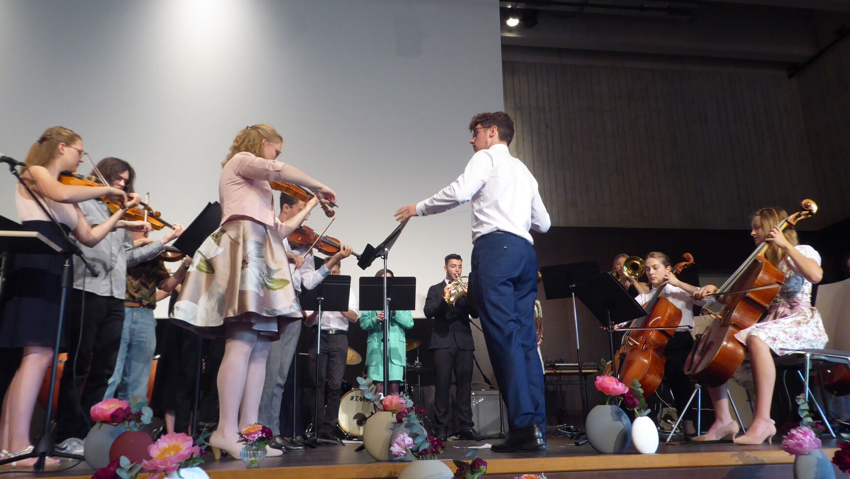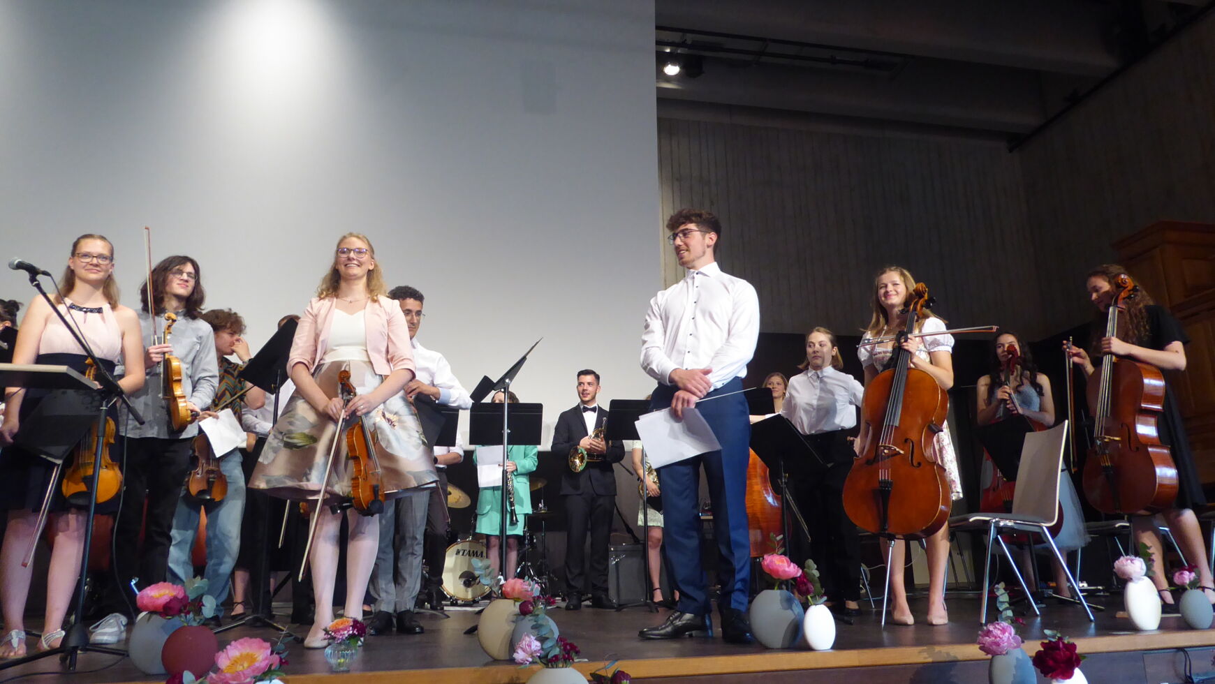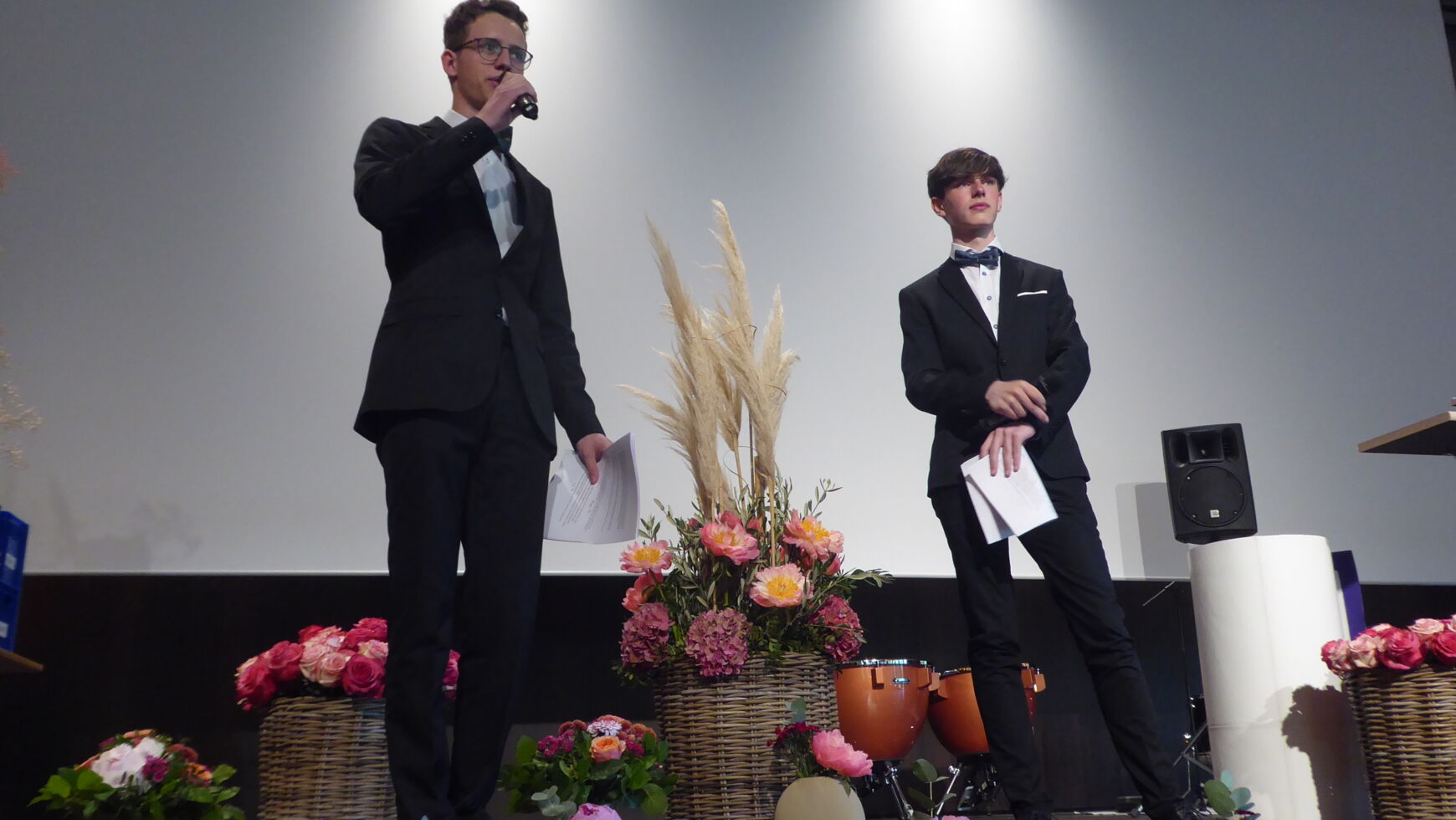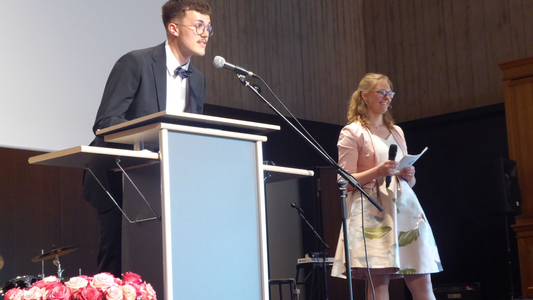 Durch die Verabschiedung führten charmant, witzig und damit äußerst kurzweilig die beiden Moderatoren Manuel Huber und Anton Biller. Wie es sich für ein musisches Gymnasium gehört, wurde diese mit vielfältigen erstklassigen musikalischen Einlagen umrahmt. Neben dem Stufenorchester, das Brahms Ungarischen Tanz No. 5 spielte, dem Chor der Q12 mit „It´s raining men“ sowie Sehmuel Wagner als Solisten trat auch die Band June calls auf.