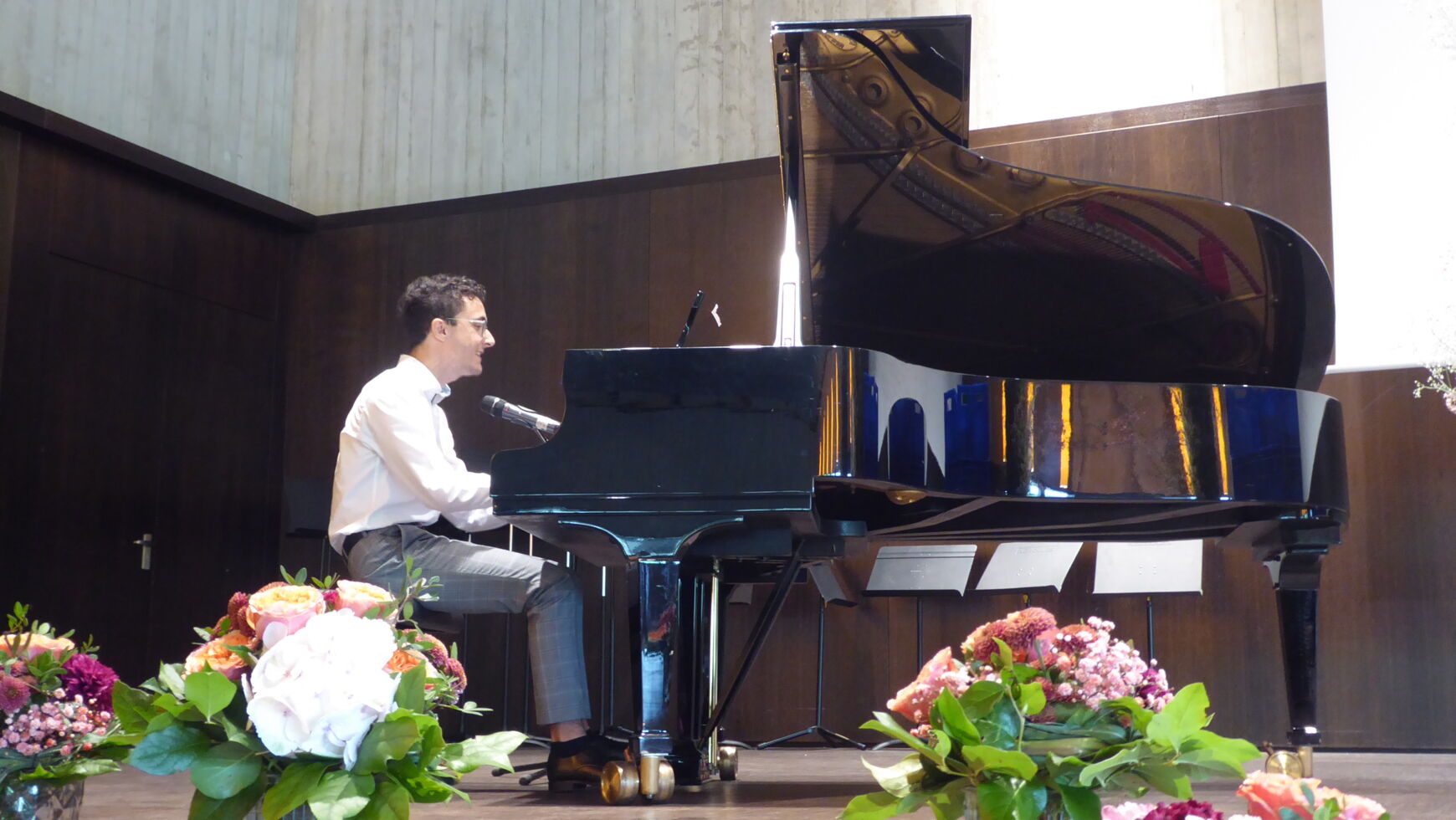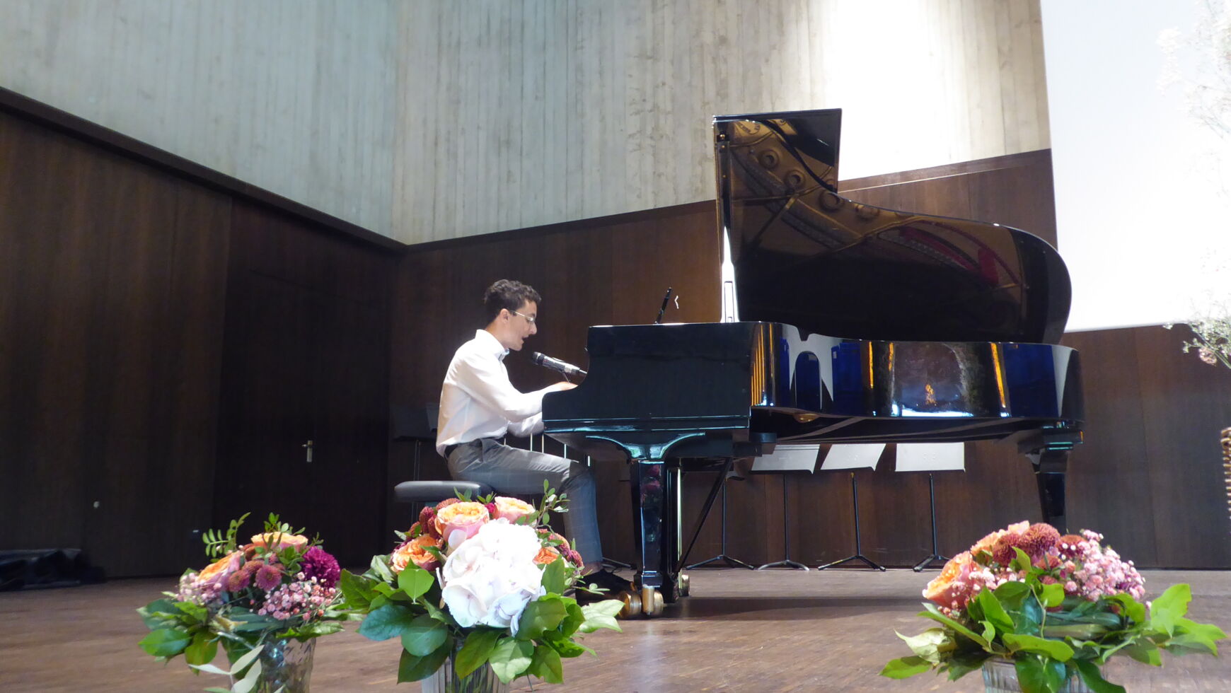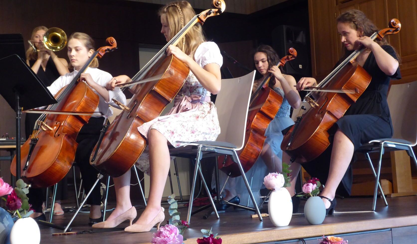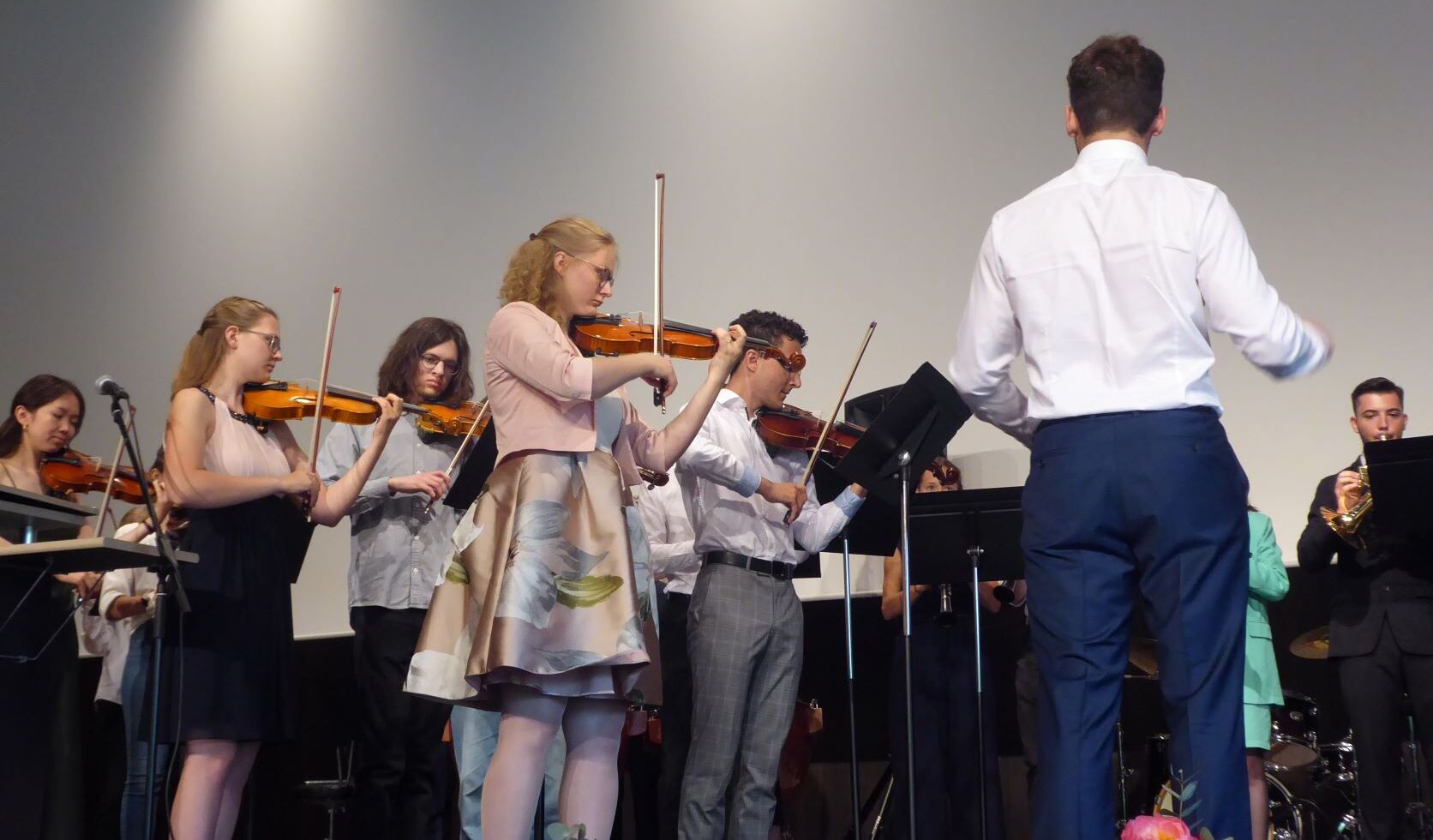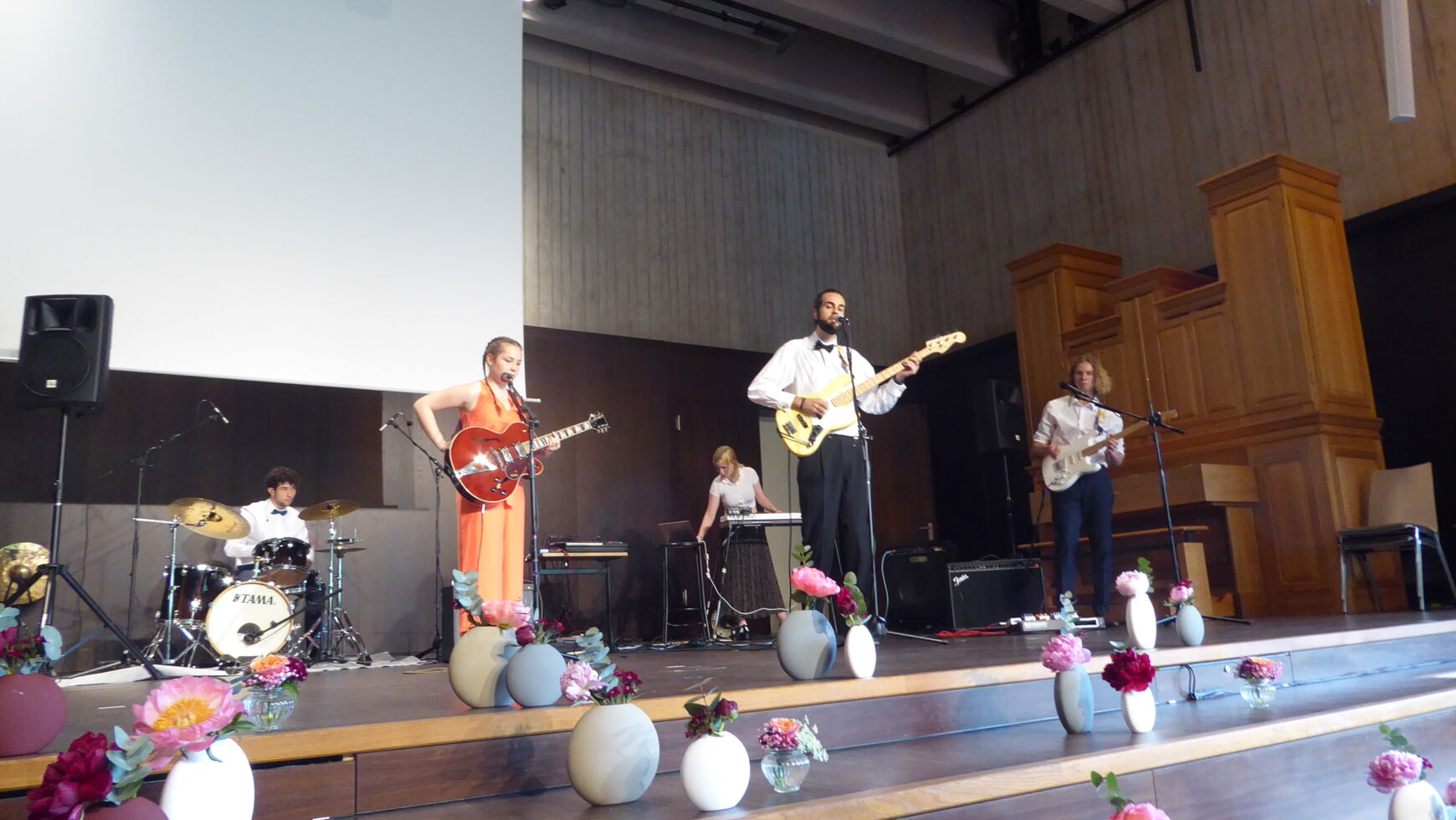 Durch die Verabschiedung führten charmant, witzig und damit äußerst kurzweilig die beiden Moderatoren Manuel Huber und Anton Biller. Wie es sich für ein musisches Gymnasium gehört, wurde diese mit vielfältigen erstklassigen musikalischen Einlagen umrahmt. Neben dem Stufenorchester, das Brahms Ungarischen Tanz No. 5 spielte, dem Chor der Q12 mit „It´s raining men“ sowie Sehmuel Wagner als Solisten trat auch die Band June calls auf.