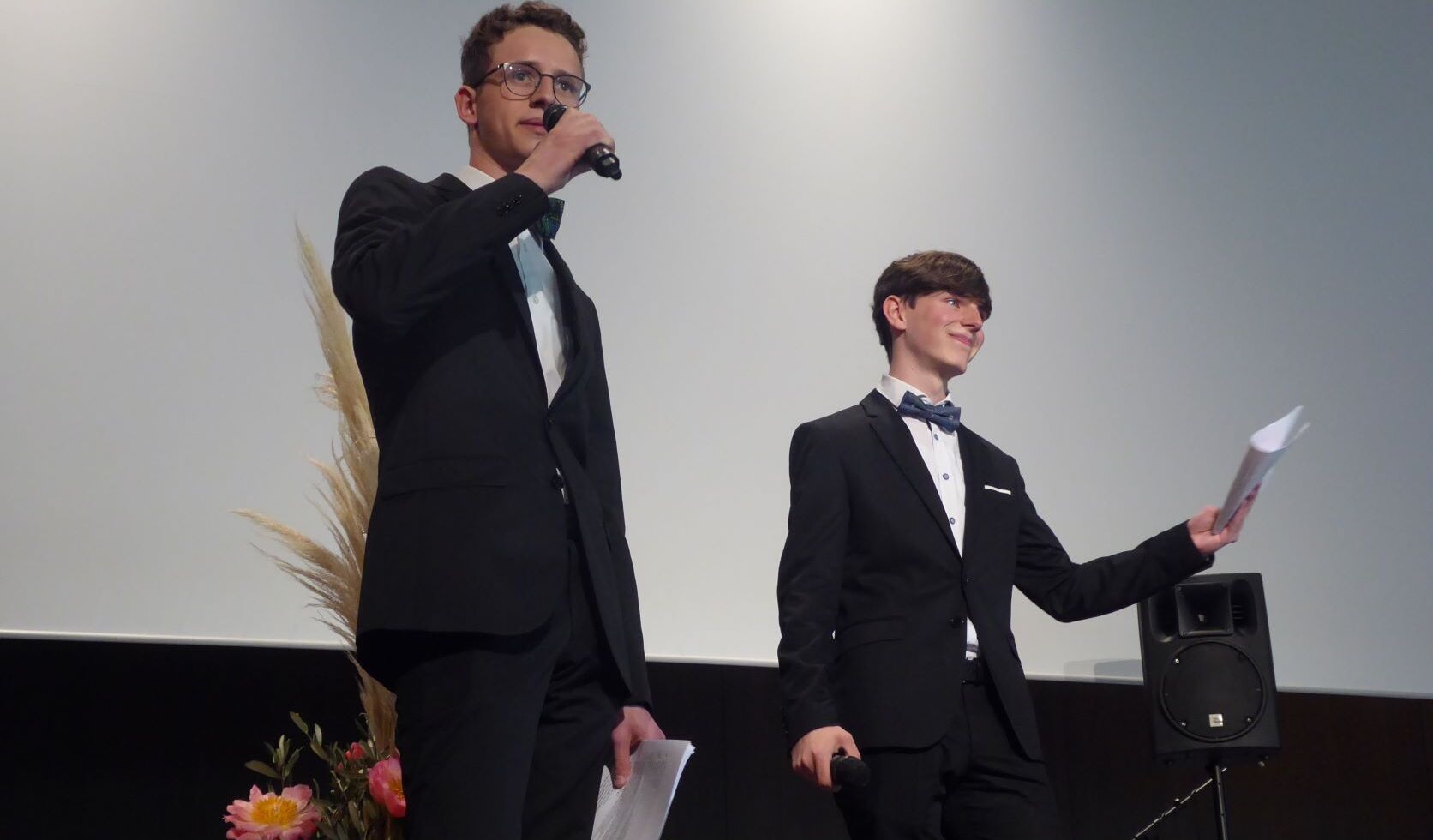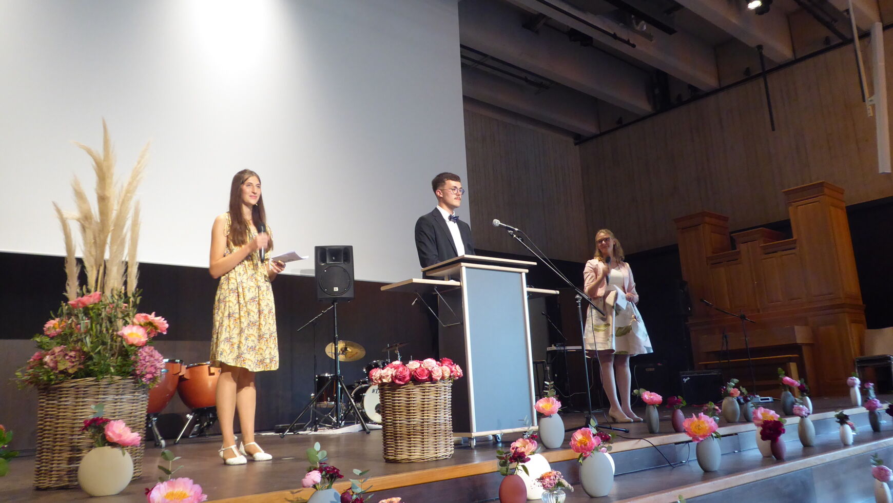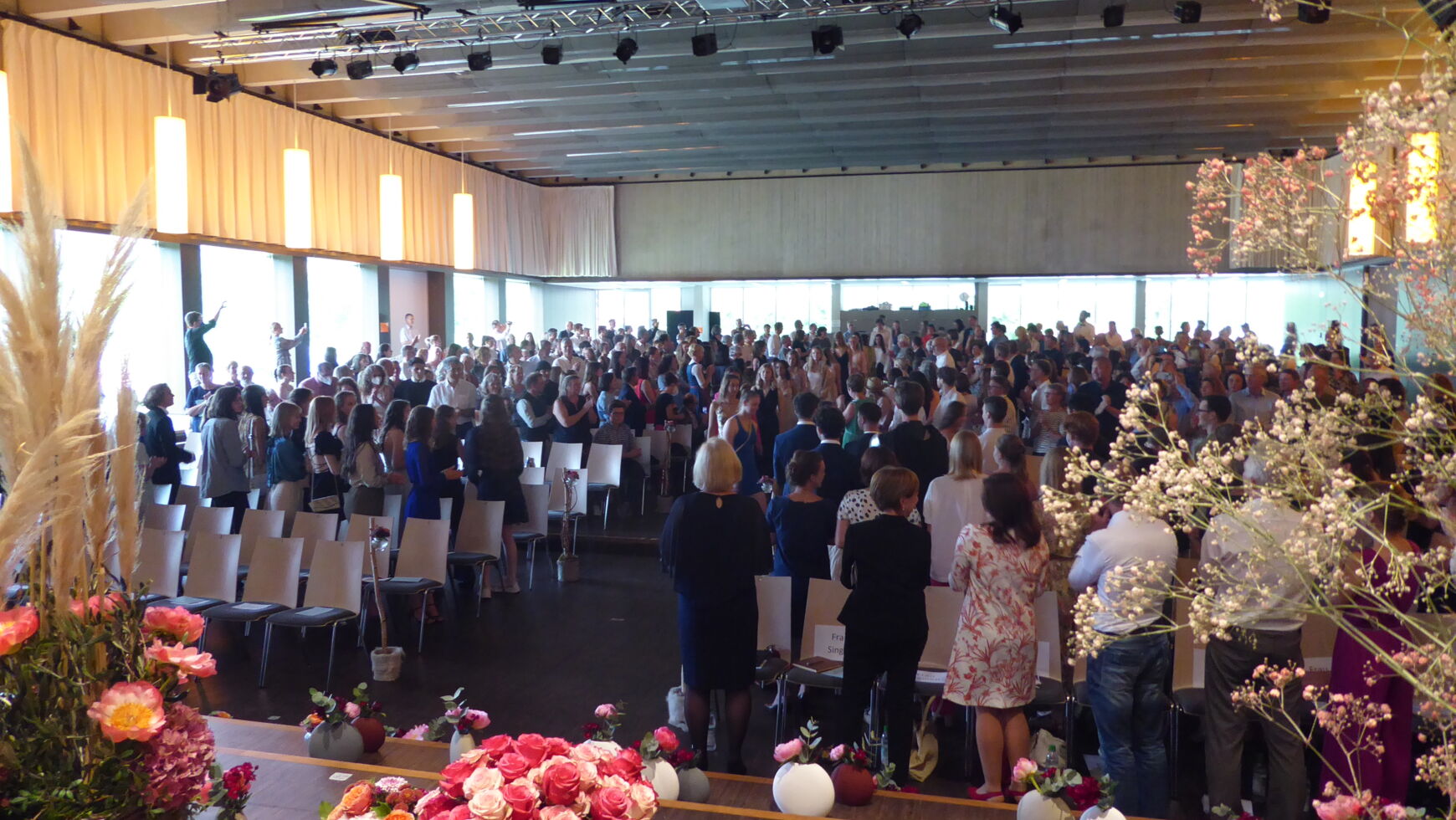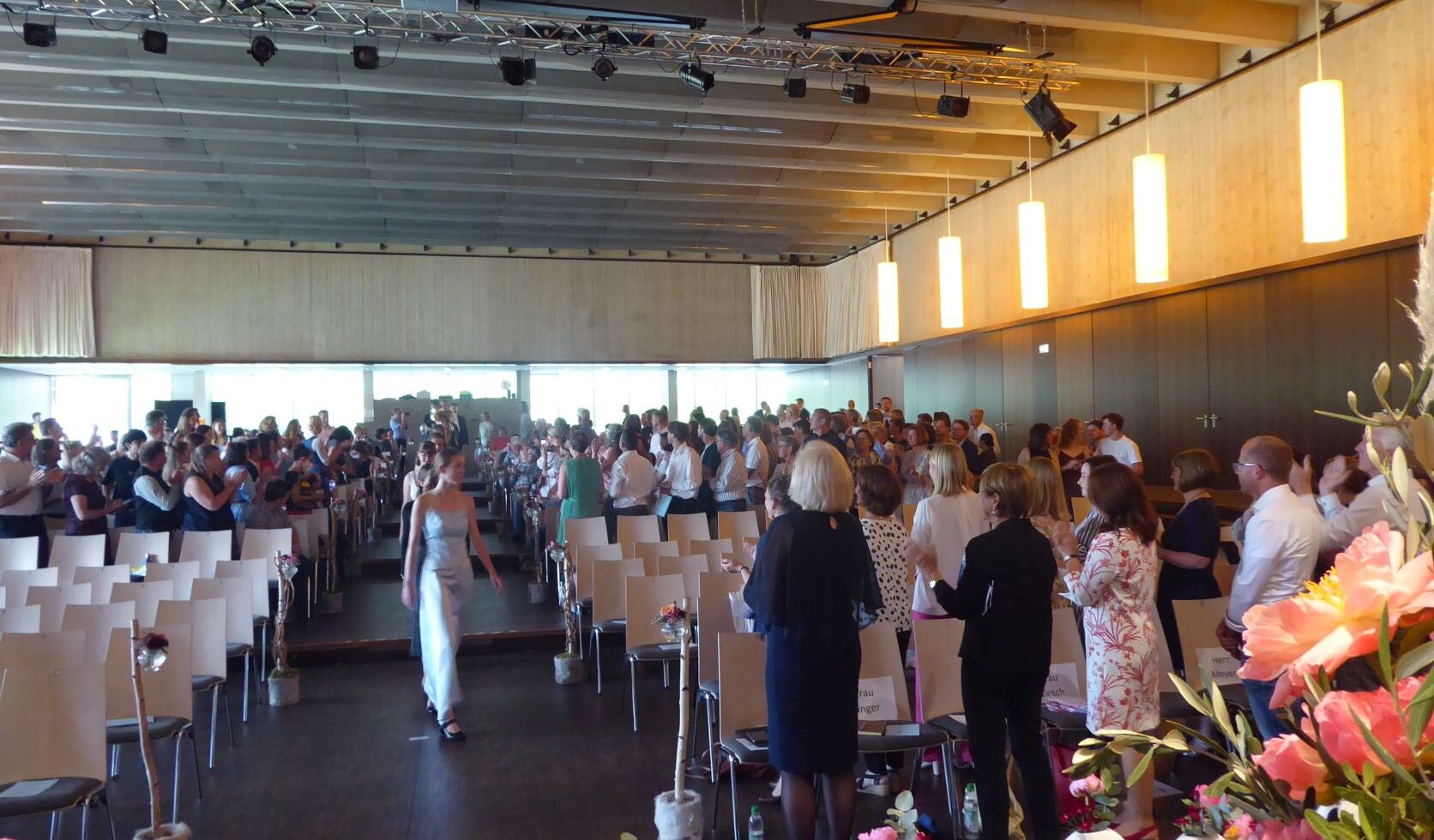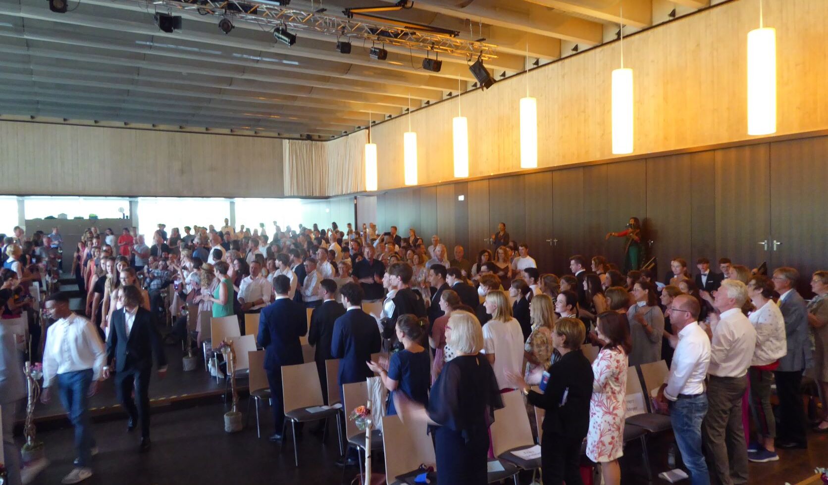 Nun kam aber der eigentliche Höhepunkt der Verabschiedung, nämlich die Verleihung der Abschlusszeugnisse an die Abiturientinnen und Abiturienten, die das endgültige Ende der Schulzeit markierte. Diese erfolgte in neun Gruppen und wurde durch eine Diashow in der Hälfte aufgelockert.