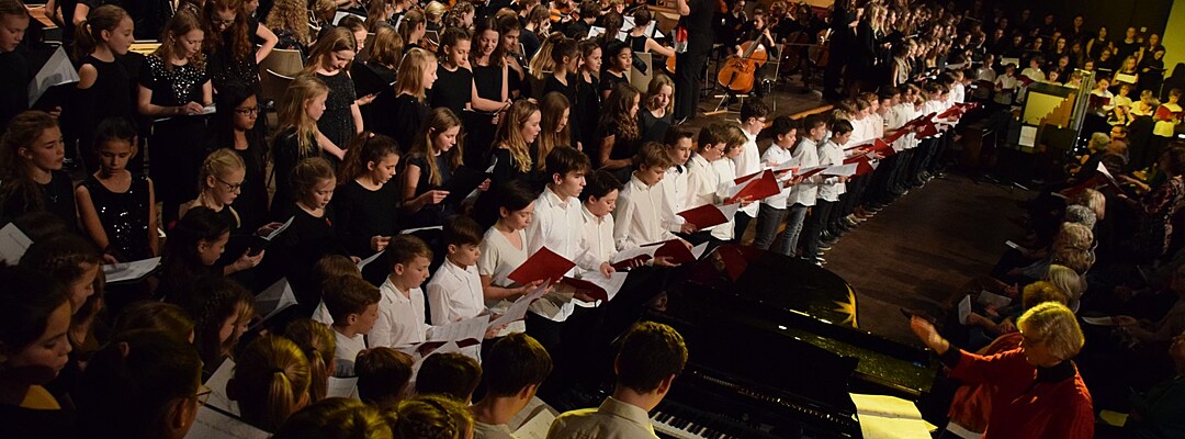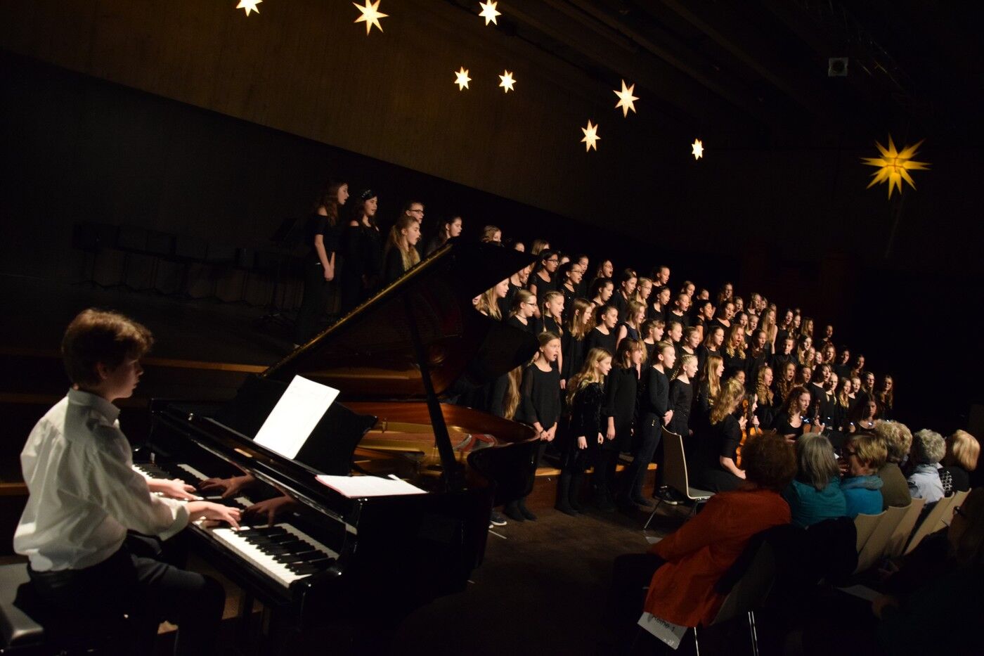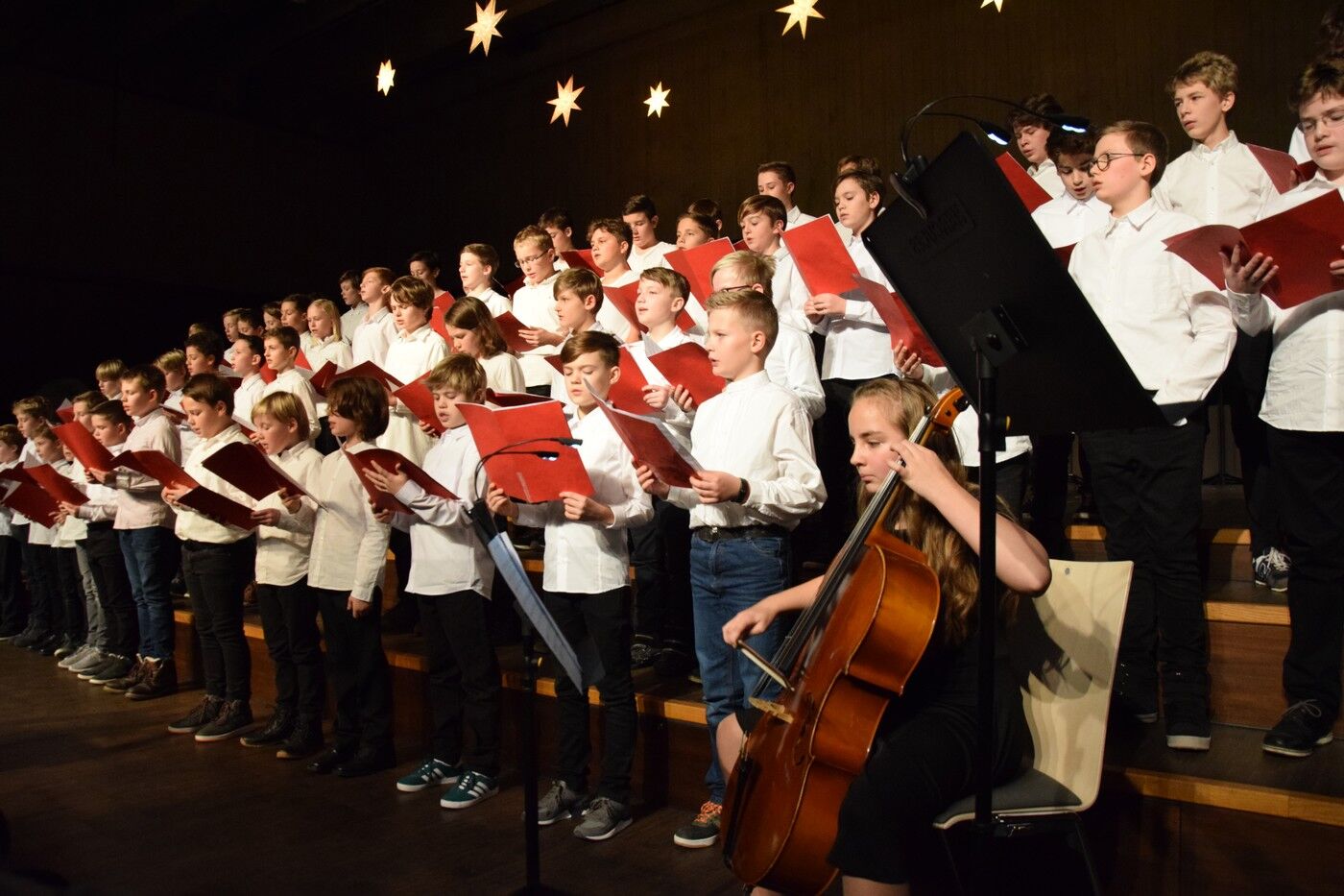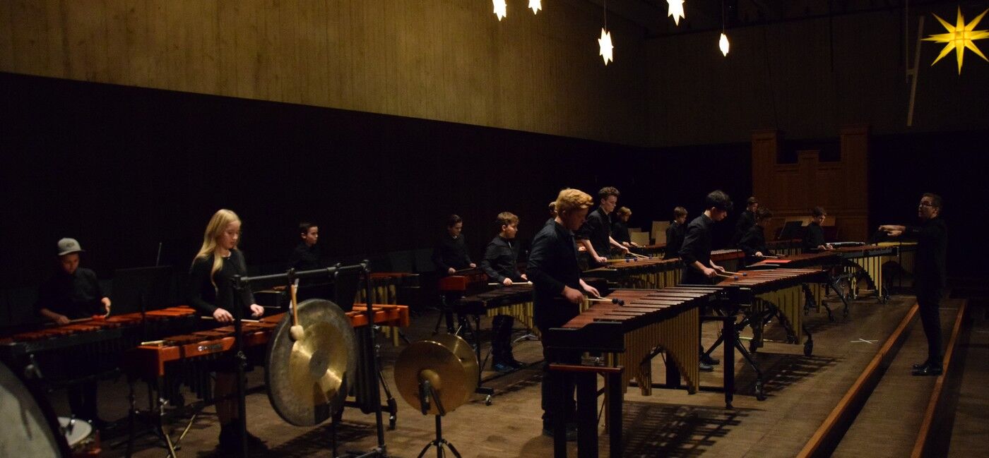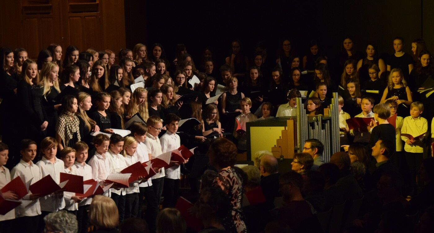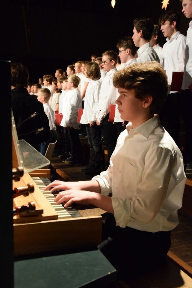Mit etwas ganz Besonderem startete das Weihnachtskonzert der „Kleinen“. Ein 50-köpfiger Knabenchor (Leitung Birgit Brennich) und ein 14-köpfiges Schlagzeugensembles (Leitung Stefan Pellmaier) sind selbst für ein musisches Gymnasium sehr außergewöhnlich. Die beiden Ensembles stimmten am Mittwochabend die Zuhörer mit „The Little Drummer Boy“ gleich auf Weihnachten ein. Das Jugendblechbläserensemble (Leitung Gunther Fendler), der Mädchenchor der 5.-6. Jahrgangstufe (Leitung Ursula Bongard), das Jugendholzbläserensemble (Leitung Lucinde Haeselbarth), der Mädchenchor der 7.-8. Klassen (Leitung Friederike Eglhuber) und das Jugendstreichorchester (Leitung Marianne Brand) hatten die unterschiedlichsten Stücke – passend zu Weihnachten – einstudiert. Beeindruckend das Ende beim Konzert der „Kleinen“. Alle Ensembles waren gemeinsam auf der Bühne und entließen das Publikum mit „Somebody’s Knocking At Your Door“ und „When The Saints Go Marching In.“