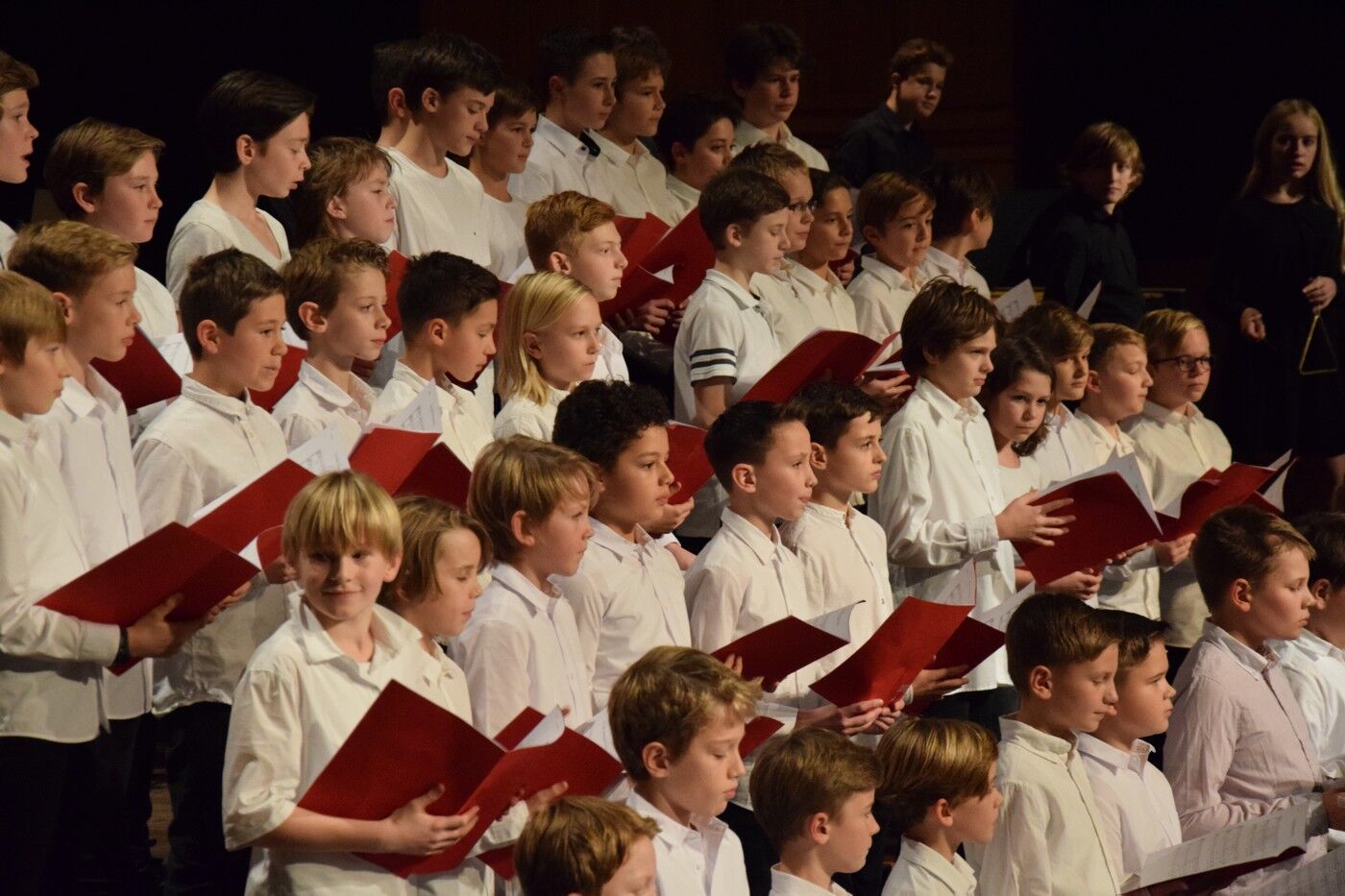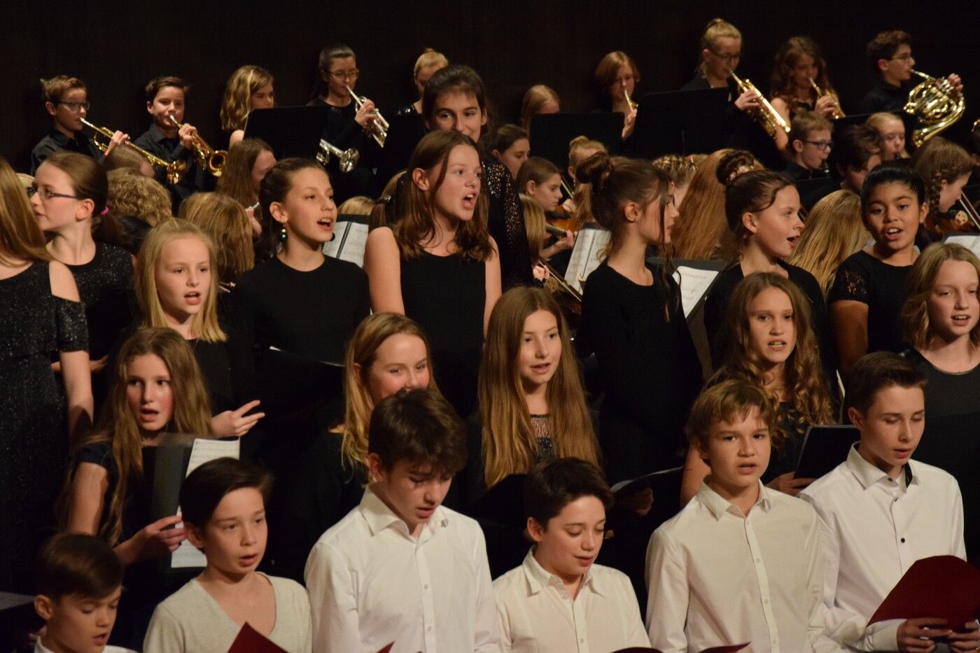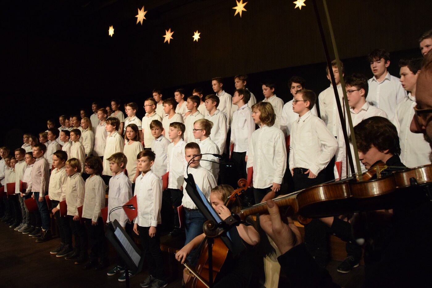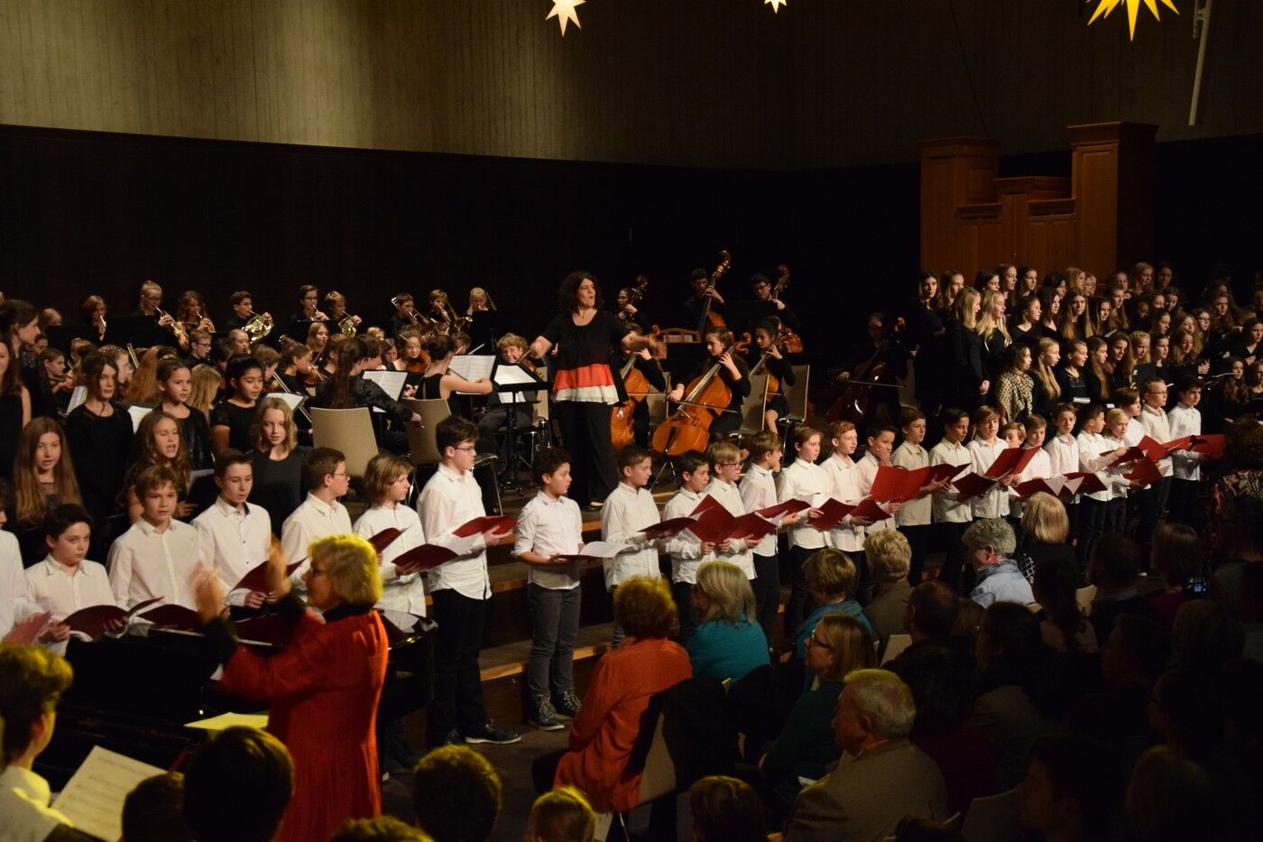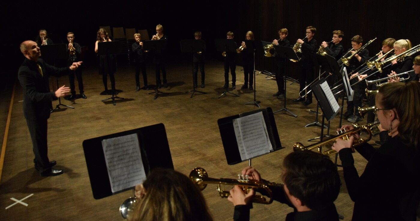 Mit etwas ganz Besonderem startete das Weihnachtskonzert der „Kleinen“. Ein 50-köpfiger Knabenchor (Leitung Birgit Brennich) und ein 14-köpfiges Schlagzeugensembles (Leitung Stefan Pellmaier) sind selbst für ein musisches Gymnasium sehr außergewöhnlich. Die beiden Ensembles stimmten am Mittwochabend die Zuhörer mit „The Little Drummer Boy“ gleich auf Weihnachten ein. Das Jugendblechbläserensemble (Leitung Gunther Fendler), der Mädchenchor der 5.-6. Jahrgangstufe (Leitung Ursula Bongard), das Jugendholzbläserensemble (Leitung Lucinde Haeselbarth), der Mädchenchor der 7.-8. Klassen (Leitung Friederike Eglhuber) und das Jugendstreichorchester (Leitung Marianne Brand) hatten die unterschiedlichsten Stücke – passend zu Weihnachten – einstudiert. Beeindruckend das Ende beim Konzert der „Kleinen“. Alle Ensembles waren gemeinsam auf der Bühne und entließen das Publikum mit „Somebody’s Knocking At Your Door“ und „When The Saints Go Marching In.“