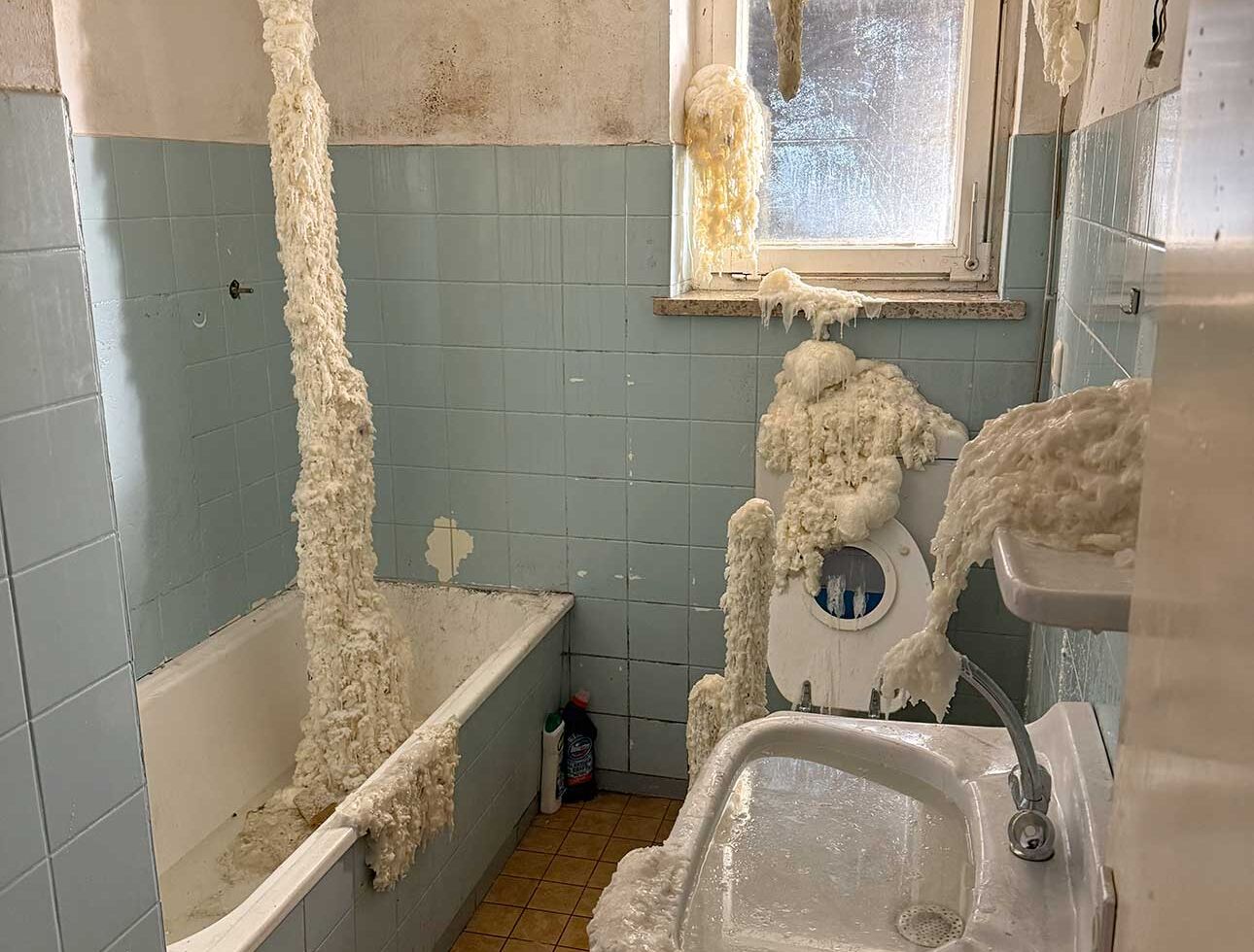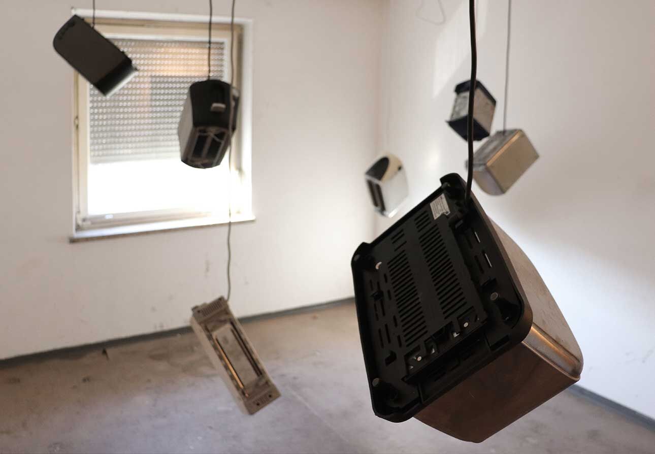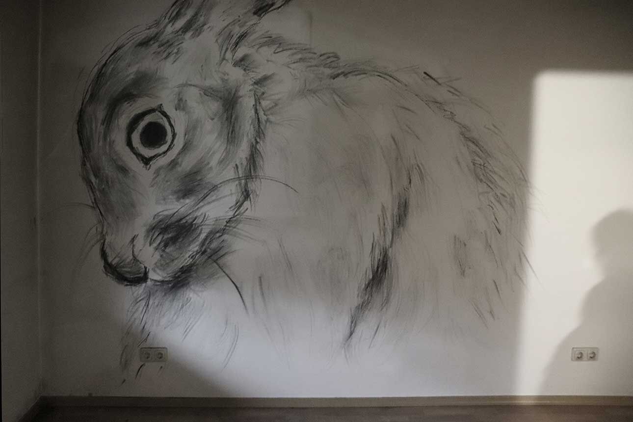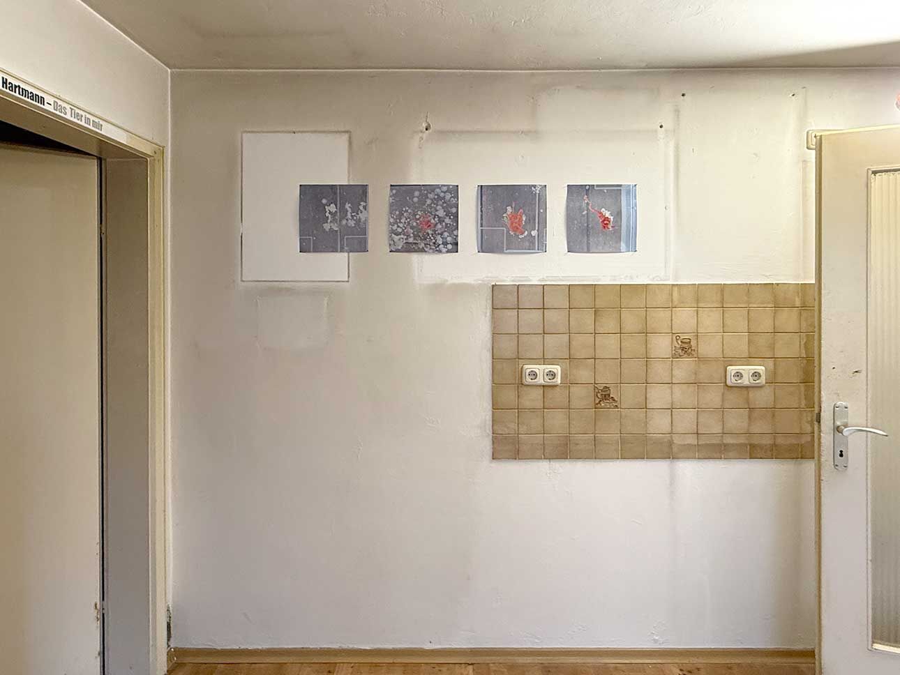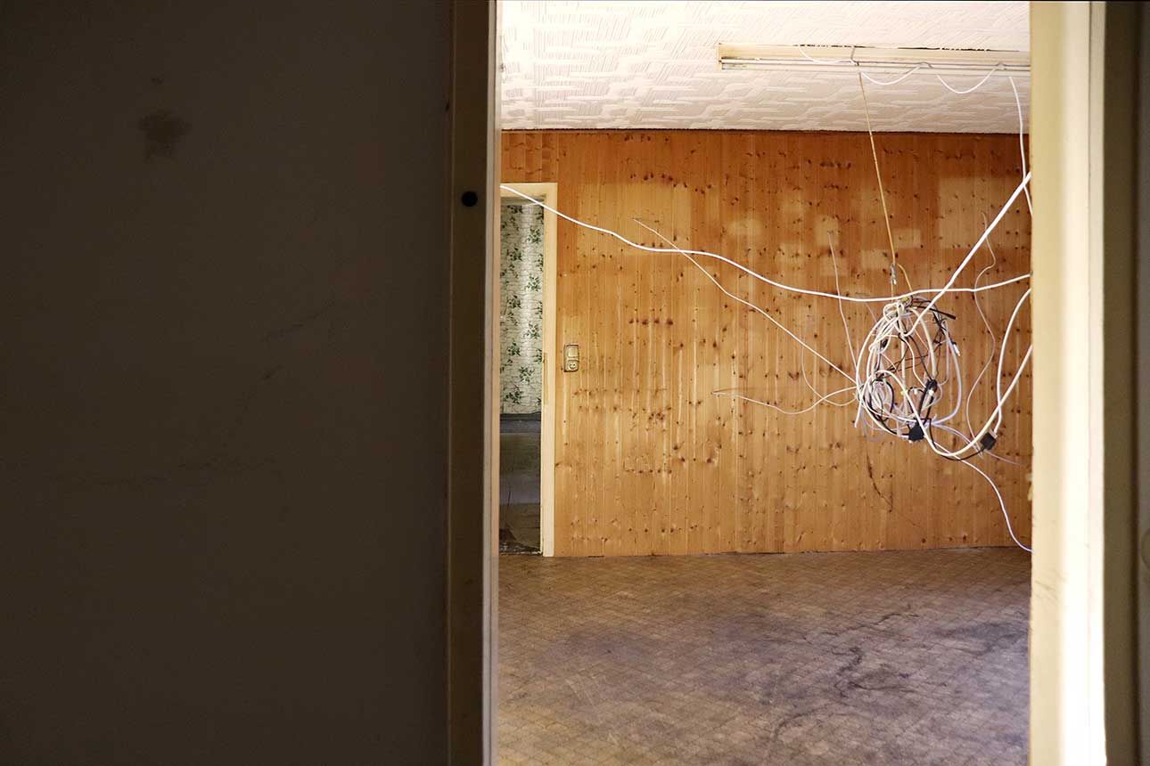 Lara Jahn etwa schloss die Spuren, die längst abgehängte Bilder in einem Wohnzimmer hinterlassen haben an ein Nervensystem aus Kabeln an, um die Erinnerungen sichtbar werden zu lassen, die das Haus durchziehen. Mit dem Hammer schlug Marlene Lasch Spuren in den Putz, die an Körper und ihre Bewegungen erinnern. Mit dieser kraftvollen Geste legte sie verborgene Schichten frei und schuf wie in prähistorischen Höhlen aus dem Ringen mit dem Material bildhafte Assoziationen. Das Haus als Körper war das Thema von Marlene Göls, die in einen Raum ein gefaltetes, schimmerndes Gebilde einzog, das an ein Hautstück erinnert, das von einer Art Narbe durchzogen wird. Verletzungen spielen auch ich der Arbeit von Annika Krippner eine wichtige Rolle. In ihrem Raum legten Sondierungsöffnungen die tragenden Strukturen des Hauses frei, gleichzeitig wurden Bereiche neu gefliest und so ein Schwebezustand zwischen Abbruch und Aufbau erreicht. Diese Zwischenwelten faszinierten auch Gian Maritz, der im Keller Fundstücke aus dem Haus zusammen mit hinzugefügten Bildern und Objekten so inszenierte, dass neue bildhafte Bezüge entstanden. Mit Taschenlampen konnten die Besucherinnen und Besucher die dunklen Kellerräume erkunden. Die Melancholie, die das seit mehreren Jahren leerstehende Haus durchzieht, wurde von Jack Lang in zwei Rauminstallationen aufgegriffen. In einem Raum ließ er Schlafsäcke wie Kokons von der Decke hängen, in einem zweiten Raum ordnete er ausgediente Alltagsobjekte zu einer wie erschlafft wirkenden Figur an. Anna Dantele fotografierte Situationen im Haus und überblendete sie mit Fotos ihrer eigenen Kindheit, um mögliche Erinnerungen sichtbar werden zu lassen und die Stimmung in dem heruntergekommenen Kinderzimmeraufzugreifen, in dem die Werke ausgestellt wurden. Die Zwischenzonen zwischen Menschen interessierten auch Emily Stojan, die den Raum zwischen Händen und anderen Körperteilen mit einer Modelliermasse abformte. Hannah Wagner und Helena Baur ließen Bilder im Raum schweben. Einmal entdeckte man bei Betreten einer Wohnung sein eigenes Bild mehrfach in den Raum projiziert, einmal wurde ein digital animierter Avatar virtuell inszeniert. Körperliche Nähe kann auch Fluchtreflexe auslösen und animalisch wirkende Ängste wachrufen. Veronica Hartmann zeichnete einen raumfüllenden panischen Hasen an die Wand einer Wohnung, in der man den sich beschleunigenden Herzschlag des Tieres hörte. Meisterhaft den Raum bespielte auch die Videoinstallation von Hannah Kirchmann. Auf die mehrere Räume verbindende Gebilde aus spiegelnder Folie wurden Erinnerungsbilder aus ihrer Kindheit projiziert, die die Versunkenheit und abgründige Spontaneität kindlichen Spielens erlebbar machten. Fast wie in Trance fühlte man sich in dem gekachelten Badezimmer, das Vitus Jaap in eine rätselhafte, von Wasser geflutete Tropfsteinhöhle verwandelte. Den Abschluss des Ausstellungsbesuchs markierte ein ebenso faszinierendes wie verstörendes Bild auf dem Dachboden. Hier hatte Vitus Jaap ein Doyho, einen Sumo-Kampflatz aus Lehm, in Originalgröße eingebaut. Zusammen mit der Lichtinszenierung, den sanft im Wind wehenden Folien und dem Klang klassischer Musik entstand eine beruhigend-beunruhigende Stimmung.