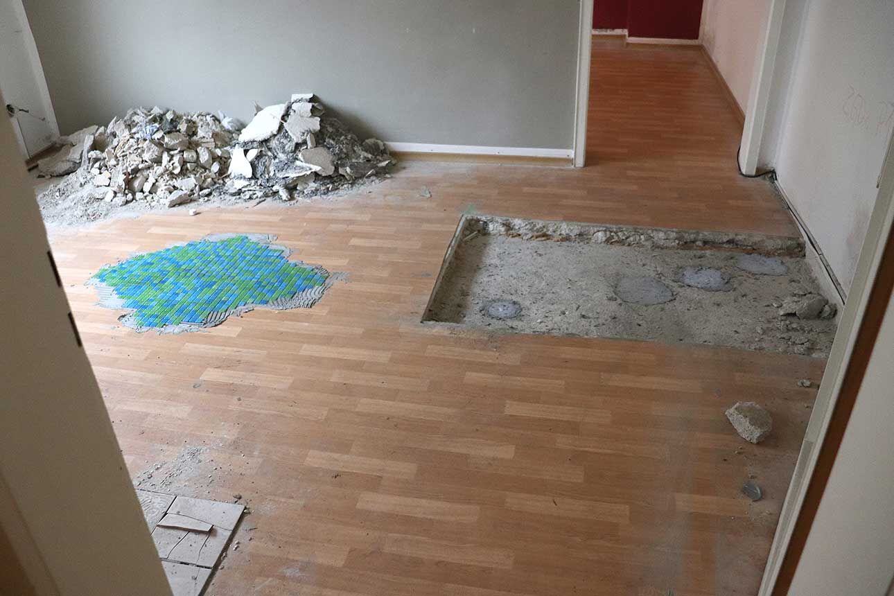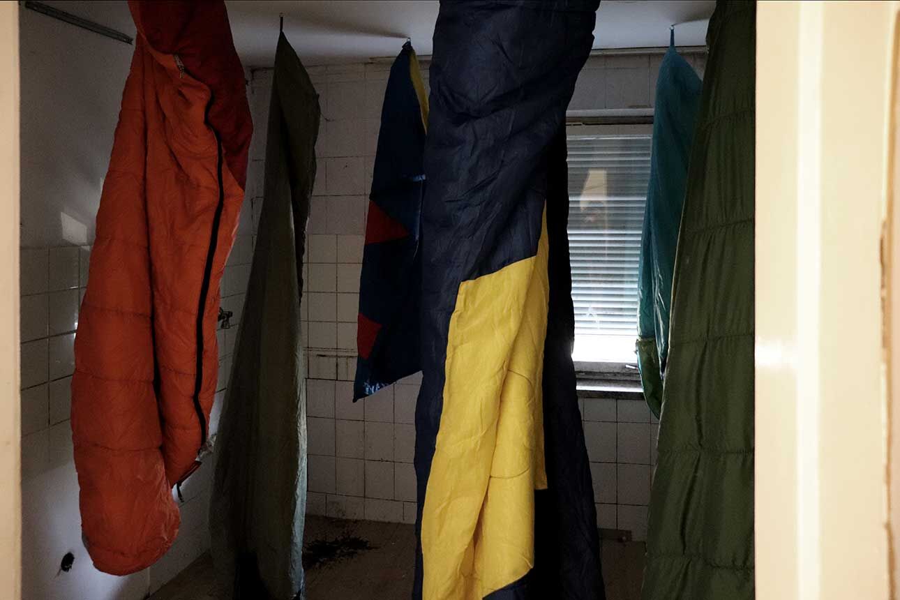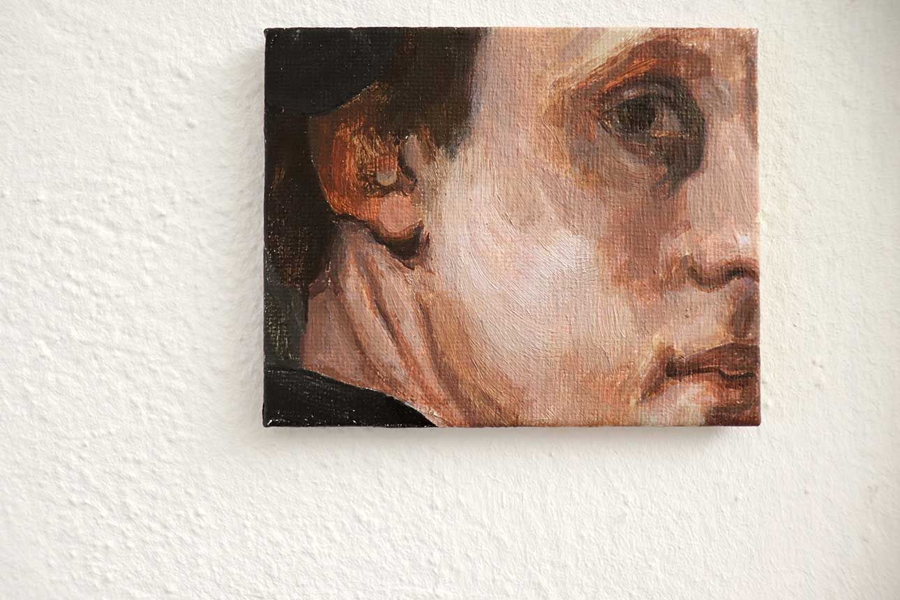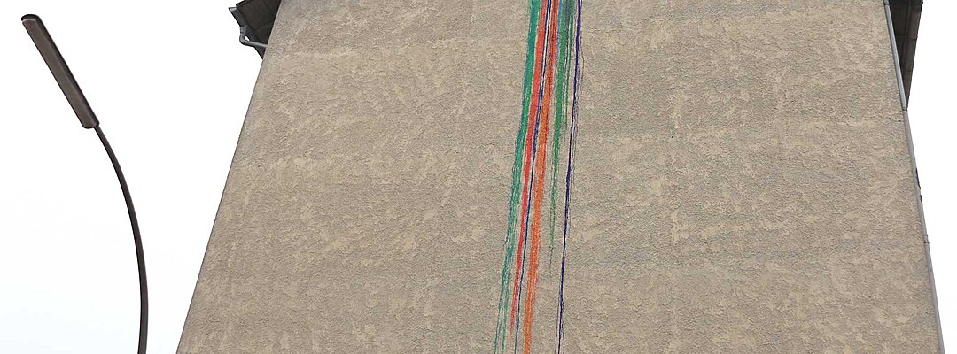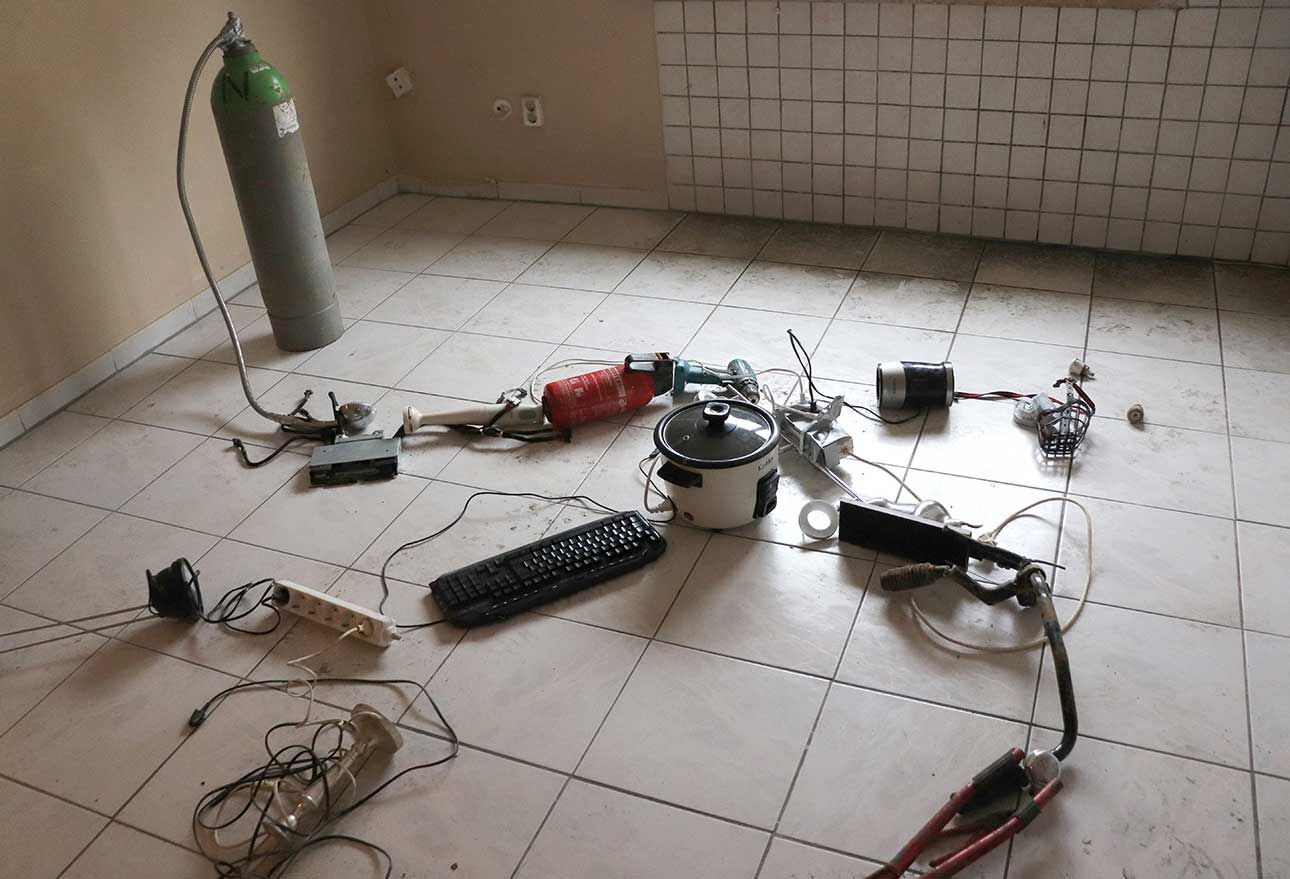 Lara Jahn etwa schloss die Spuren, die längst abgehängte Bilder in einem Wohnzimmer hinterlassen haben an ein Nervensystem aus Kabeln an, um die Erinnerungen sichtbar werden zu lassen, die das Haus durchziehen. Mit dem Hammer schlug Marlene Lasch Spuren in den Putz, die an Körper und ihre Bewegungen erinnern. Mit dieser kraftvollen Geste legte sie verborgene Schichten frei und schuf wie in prähistorischen Höhlen aus dem Ringen mit dem Material bildhafte Assoziationen. Das Haus als Körper war das Thema von Marlene Göls, die in einen Raum ein gefaltetes, schimmerndes Gebilde einzog, das an ein Hautstück erinnert, das von einer Art Narbe durchzogen wird. Verletzungen spielen auch ich der Arbeit von Annika Krippner eine wichtige Rolle. In ihrem Raum legten Sondierungsöffnungen die tragenden Strukturen des Hauses frei, gleichzeitig wurden Bereiche neu gefliest und so ein Schwebezustand zwischen Abbruch und Aufbau erreicht. Diese Zwischenwelten faszinierten auch Gian Maritz, der im Keller Fundstücke aus dem Haus zusammen mit hinzugefügten Bildern und Objekten so inszenierte, dass neue bildhafte Bezüge entstanden. Mit Taschenlampen konnten die Besucherinnen und Besucher die dunklen Kellerräume erkunden. Die Melancholie, die das seit mehreren Jahren leerstehende Haus durchzieht, wurde von Jack Lang in zwei Rauminstallationen aufgegriffen. In einem Raum ließ er Schlafsäcke wie Kokons von der Decke hängen, in einem zweiten Raum ordnete er ausgediente Alltagsobjekte zu einer wie erschlafft wirkenden Figur an. Anna Dantele fotografierte Situationen im Haus und überblendete sie mit Fotos ihrer eigenen Kindheit, um mögliche Erinnerungen sichtbar werden zu lassen und die Stimmung in dem heruntergekommenen Kinderzimmeraufzugreifen, in dem die Werke ausgestellt wurden. Die Zwischenzonen zwischen Menschen interessierten auch Emily Stojan, die den Raum zwischen Händen und anderen Körperteilen mit einer Modelliermasse abformte. Hannah Wagner und Helena Baur ließen Bilder im Raum schweben. Einmal entdeckte man bei Betreten einer Wohnung sein eigenes Bild mehrfach in den Raum projiziert, einmal wurde ein digital animierter Avatar virtuell inszeniert. Körperliche Nähe kann auch Fluchtreflexe auslösen und animalisch wirkende Ängste wachrufen. Veronica Hartmann zeichnete einen raumfüllenden panischen Hasen an die Wand einer Wohnung, in der man den sich beschleunigenden Herzschlag des Tieres hörte. Meisterhaft den Raum bespielte auch die Videoinstallation von Hannah Kirchmann. Auf die mehrere Räume verbindende Gebilde aus spiegelnder Folie wurden Erinnerungsbilder aus ihrer Kindheit projiziert, die die Versunkenheit und abgründige Spontaneität kindlichen Spielens erlebbar machten. Fast wie in Trance fühlte man sich in dem gekachelten Badezimmer, das Vitus Jaap in eine rätselhafte, von Wasser geflutete Tropfsteinhöhle verwandelte. Den Abschluss des Ausstellungsbesuchs markierte ein ebenso faszinierendes wie verstörendes Bild auf dem Dachboden. Hier hatte Vitus Jaap ein Doyho, einen Sumo-Kampflatz aus Lehm, in Originalgröße eingebaut. Zusammen mit der Lichtinszenierung, den sanft im Wind wehenden Folien und dem Klang klassischer Musik entstand eine beruhigend-beunruhigende Stimmung.