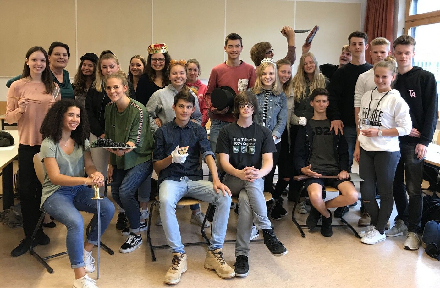 Bewaffnet mit Perücken, einem Kunstbart und jeder Menge Humor gab uns Vera Reich am Projekttag 2017 einen je halbtätigen Schnellkurs zum Thema „Benimm ist in“. Natürlich kennt man die ein oder anderen gesellschaftlichen Normen, wie zum Beispiel, dass man beim Vorstellen immer den Artikel vor seinem Namen weglassen, im Smalltalk nicht über Religion, Krankheiten oder Politik sprechen sollte oder auch, was die Körpersprache über die eigene Einstellung verraten kann. Doch auf der anderen Seite gab es mehrere Regeln, von denen wir so noch nicht gehört hatten oder auch Etikette, auf die keiner von uns bis jetzt geachtet hatte. Wusstet ihr zum Beispiel, dass der Kellner in einem Restaurant daran, wo die Besucher stehen, erkennt, wer der Gast und wer der Gastgeber ist? Wird man eingeladen, sollte man sich immer rechts von seiner Begleitung positionieren. Sicher kennt ihr es auch, wenn man an Neujahr mit Freunden oder der Familie anstößt. In einem feinen Restaurant oder bei einem Firmenessen sollte man allerdings darauf verzichten und den Stoß lieber nur andeuten. In drei Schritten prostet man sich zu: Erst wird das Glas angehoben, alle reihum angeschaut, dann kann der Gastgeber einen kurzen Trinkspruch loswerden, nach dem Trinken wird das Glas allerdings noch einmal angehoben, mit allen ein zweites mal Blickkontakt aufgenommen und erst dann abgestellt. Sicher, jeder hat ein anderes Esstempo, allerdings sollte man sich immer dem der anderen anpassen. Langsamesser, um den zeitlichen Ablauf nicht zu gefährden; Schnellesser, um sich der Gesellschaft anzupassen. Für Hungrige ist ein feines Geschäftsessen also eher nichts. Zum einen darf das eigene Messer den Brotauftrich im Schälchen nur einmal berühren, mit dem Vorlegebesteck darf man mehrmals nachnehmen. Auch brauchen sich Jugendliche ab 16 Jahren, nicht mehr dutzen zu lassen. Doch wie macht man das dem Gegenüber charmant und souverän deutlich? Erst für das Duz-Angebot bedanken und dann lächelnd klarstellen, dass man lieber beim „Sie“ bleibt.“